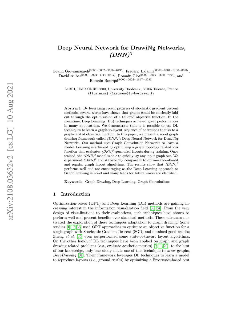 By leveraging recent progress of stochastic gradient descent methods, several works have shown that graphs could be efficiently laid out through the optimization of a tailored objective function. In the meantime, Deep Learning (DL) techniques achieved great performances in many applications. We demonstrate that it is possible to use DL techniques to learn a graph-to-layout sequence of operations thanks to a graph-related objective function. In this paper, we present a novel graph drawing framework called (DNN)^2: Deep Neural Network for DrawiNg Networks. Our method uses Graph Convolution Networks to learn a model. Learning is achieved by optimizing a graph topology related loss function that evaluates (DNN)^2 generated layouts during training. Once trained, the (DNN)^ model is able to quickly lay any input graph out. We experiment (DNN)^2 and statistically compare it to optimization-based and regular graph layout algorithms. The results show that (DNN)^2 performs well and are encouraging as the Deep Learning approach to Graph Drawing is novel and many leads for future works are identified.