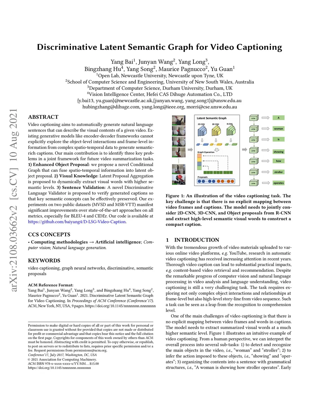 Video captioning aims to automatically generate natural language sentences that can describe the visual contents of a given video. Existing generative models like encoder-decoder frameworks cannot explicitly explore the object-level interactions and frame-level information from complex spatio-temporal data to generate semantic-rich captions. Our main contribution is to identify three key problems in a joint framework for future video summarization tasks. 1) Enhanced Object Proposal: we propose a novel Conditional Graph that can fuse spatio-temporal information into latent object proposal. 2) Visual Knowledge: Latent Proposal Aggregation is proposed to dynamically extract visual words with higher semantic levels. 3) Sentence Validation: A novel Discriminative Language Validator is proposed to verify generated captions so that key semantic concepts can be effectively preserved. Our experiments on two public datasets (MVSD and MSR-VTT) manifest significant improvements over state-of-the-art approaches on all metrics, especially for BLEU-4 and CIDEr. Our code is available at https://github.com/baiyang4/D-LSG-Video-Caption.