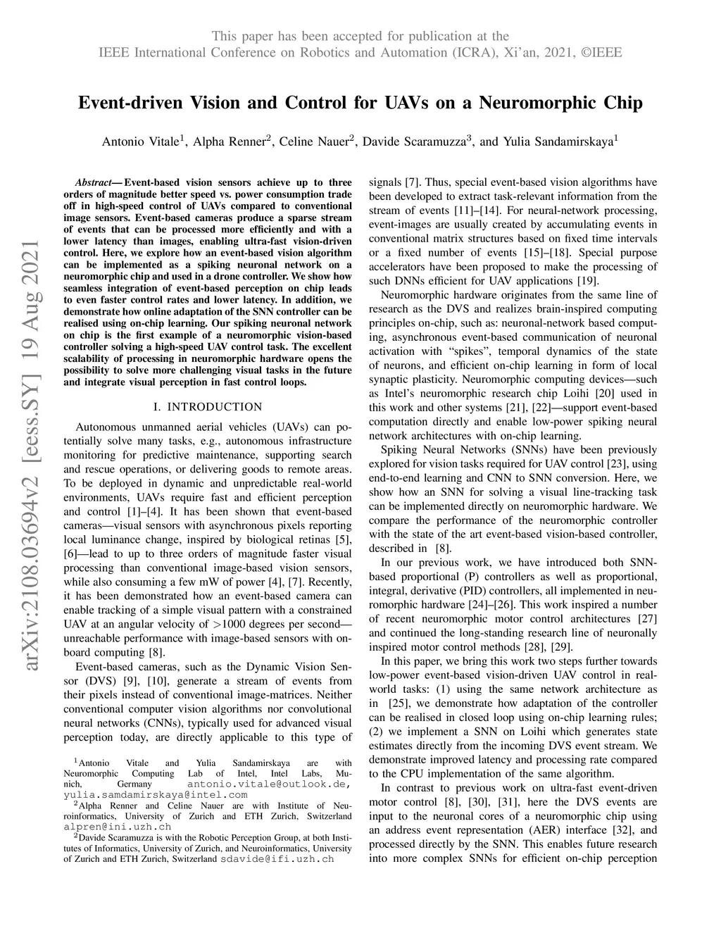 Event-driven Vision and Control for UAVs on a Neuromorphic Chip