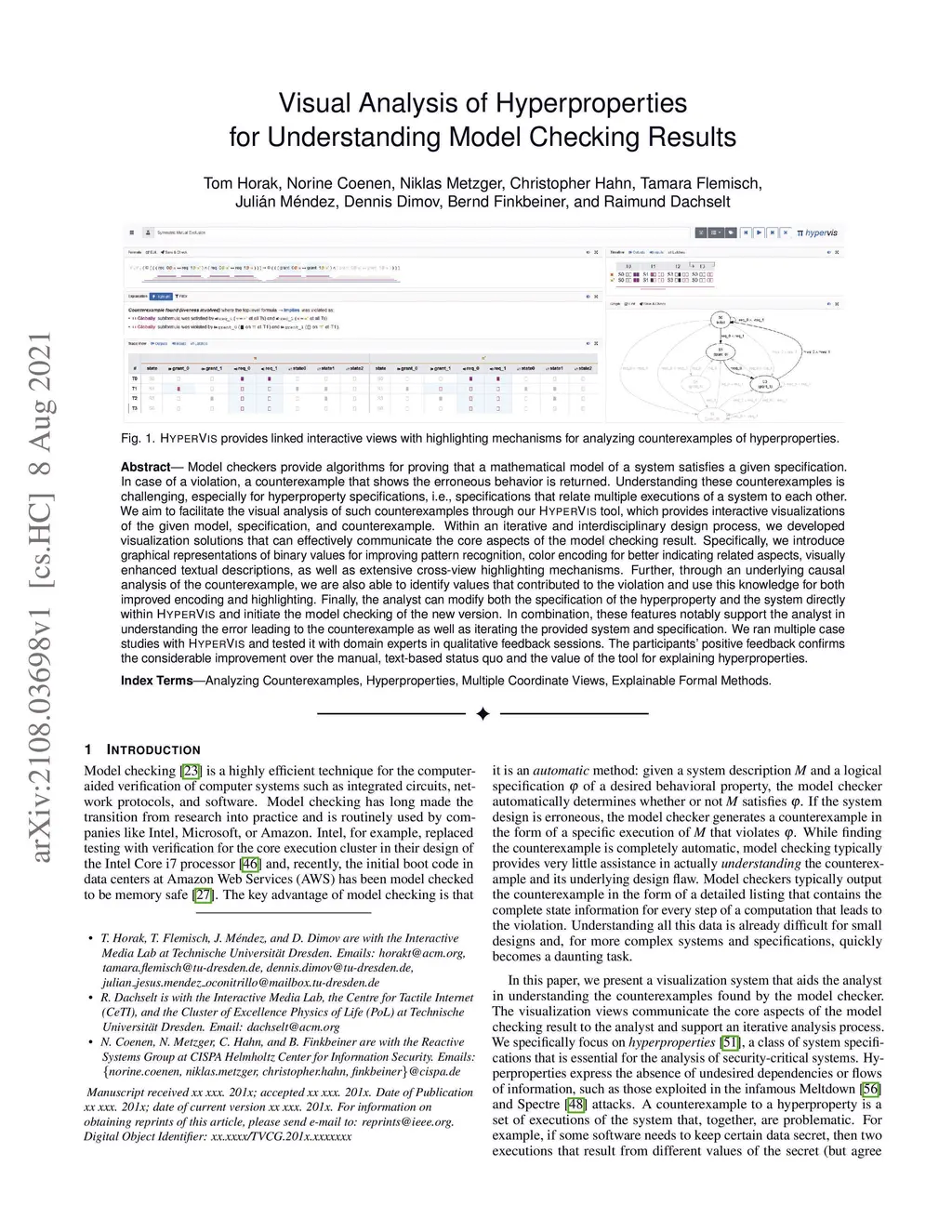 Model checkers provide algorithms for proving that a mathematical model of a system satisfies a given specification. In case of a violation, a counterexample that shows the erroneous behavior is returned. Understanding these counterexamples is challenging, especially for hyperproperty specifications, i.e., specifications that relate multiple executions of a system to each other. We aim to facilitate the visual analysis of such counterexamples through our HyperVis tool, which provides interactive visualizations of the given model, specification, and counterexample. Within an iterative and interdisciplinary design process, we developed visualization solutions that can effectively communicate the core aspects of the model checking result. Specifically, we introduce graphical representations of binary values for improving pattern recognition, color encoding for better indicating related aspects, visually enhanced textual descriptions, as well as extensive cross-view highlighting mechanisms. Further, through an underlying causal analysis of the counterexample, we are also able to identify values that contributed to the violation and use this knowledge for both improved encoding and highlighting. Finally, the analyst can modify both the specification of the hyperproperty and the system directly within HyperVis and initiate the model checking of the new version. In combination, these features notably support the analyst in understanding the error leading to the counterexample as well as iterating the provided system and specification. We ran multiple case studies with HyperVis and tested it with domain experts in qualitative feedback sessions. The participants' positive feedback confirms the considerable improvement over the manual, text-based status quo and the value of the tool for explaining hyperproperties.