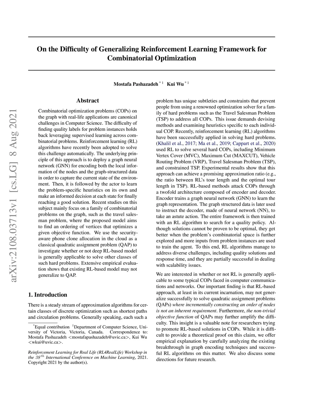 Combinatorial optimization problems (COPs) on the graph with real-life applications are canonical challenges in Computer Science. The difficulty of finding quality labels for problem instances holds back leveraging supervised learning across combinatorial problems. Reinforcement learning (RL) algorithms have recently been adopted to solve this challenge automatically. The underlying principle of this approach is to deploy a graph neural network (GNN) for encoding both the local information of the nodes and the graph-structured data in order to capture the current state of the environment. Then, it is followed by the actor to learn the problem-specific heuristics on its own and make an informed decision at each state for finally reaching a good solution. Recent studies on this subject mainly focus on a family of combinatorial problems on the graph, such as the travel salesman problem, where the proposed model aims to find an ordering of vertices that optimizes a given objective function. We use the security-aware phone clone allocation in the cloud as a classical quadratic assignment problem (QAP) to investigate whether or not deep RL-based model is generally applicable to solve other classes of such hard problems. Extensive empirical evaluation shows that existing RL-based model may not generalize to QAP.
