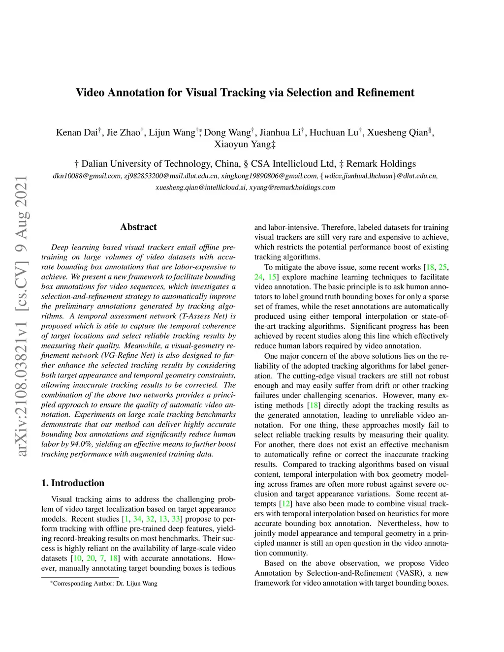 Deep learning based visual trackers entail offline pre-training on large volumes of video datasets with accurate bounding box annotations that are labor-expensive to achieve. We present a new framework to facilitate bounding box annotations for video sequences, which investigates a selection-and-refinement strategy to automatically improve the preliminary annotations generated by tracking algorithms. A temporal assessment network (T-Assess Net) is proposed which is able to capture the temporal coherence of target locations and select reliable tracking results by measuring their quality. Meanwhile, a visual-geometry refinement network (VG-Refine Net) is also designed to further enhance the selected tracking results by considering both target appearance and temporal geometry constraints, allowing inaccurate tracking results to be corrected. The combination of the above two networks provides a principled approach to ensure the quality of automatic video annotation. Experiments on large scale tracking benchmarks demonstrate that our method can deliver highly accurate bounding box annotations and significantly reduce human labor by 94.0%, yielding an effective means to further boost tracking performance with augmented training data.