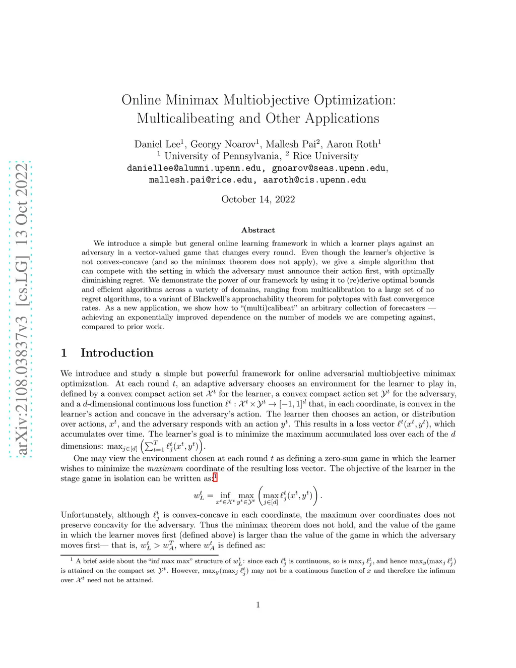 Online Minimax Multiobjective Optimization: Multicalibeating and Other