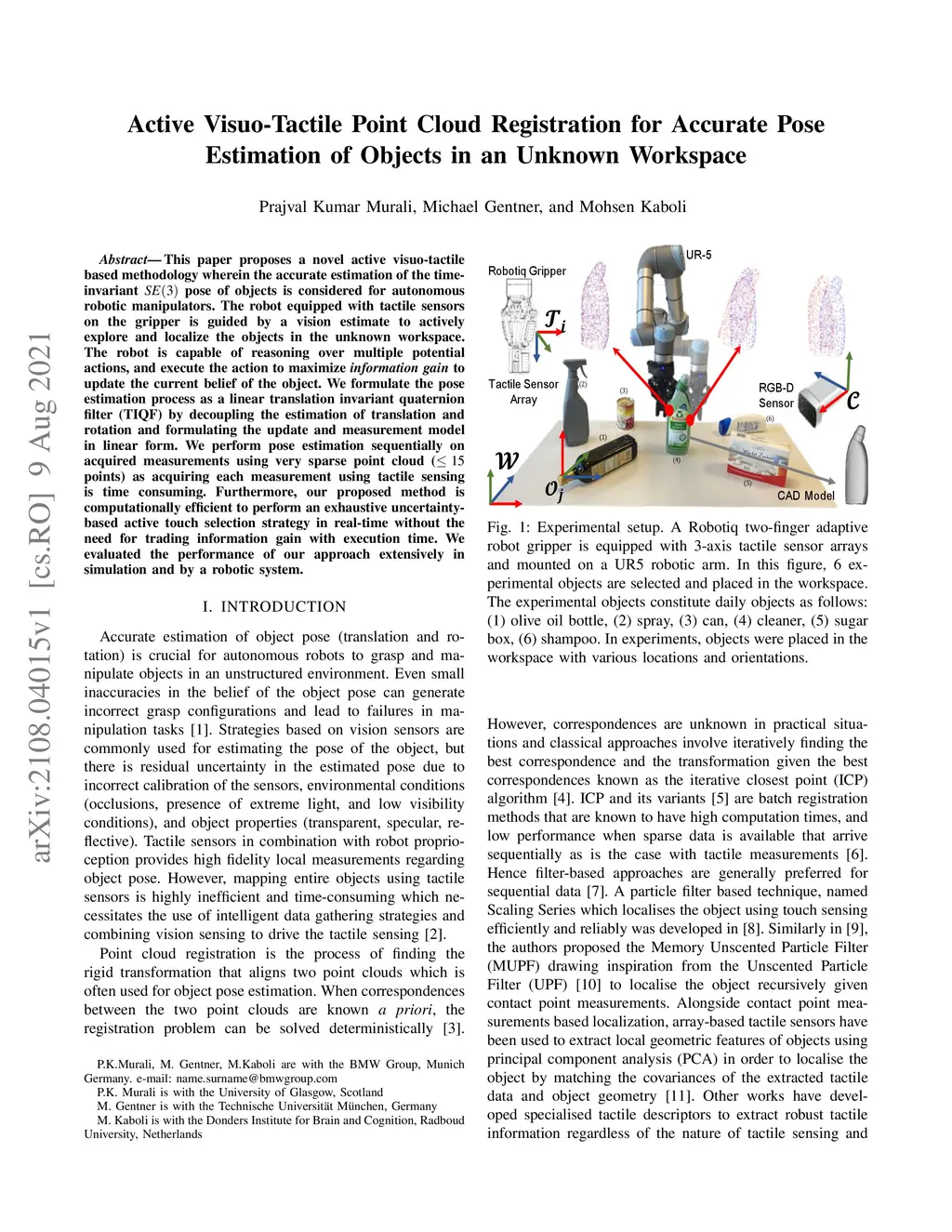 This paper proposes a novel active visuo-tactile based methodology wherein the accurate estimation of the time-invariant SE(3) pose of objects is considered for autonomous robotic manipulators. The robot equipped with tactile sensors on the gripper is guided by a vision estimate to actively explore and localize the objects in the unknown workspace. The robot is capable of reasoning over multiple potential actions, and execute the action to maximize information gain to update the current belief of the object. We formulate the pose estimation process as a linear translation invariant quaternion filter (TIQF) by decoupling the estimation of translation and rotation and formulating the update and measurement model in linear form. We perform pose estimation sequentially on acquired measurements using very sparse point cloud as acquiring each measurement using tactile sensing is time consuming. Furthermore, our proposed method is computationally efficient to perform an exhaustive uncertainty-based active touch selection strategy in real-time without the need for trading information gain with execution time. We evaluated the performance of our approach extensively in simulation and by a robotic system.