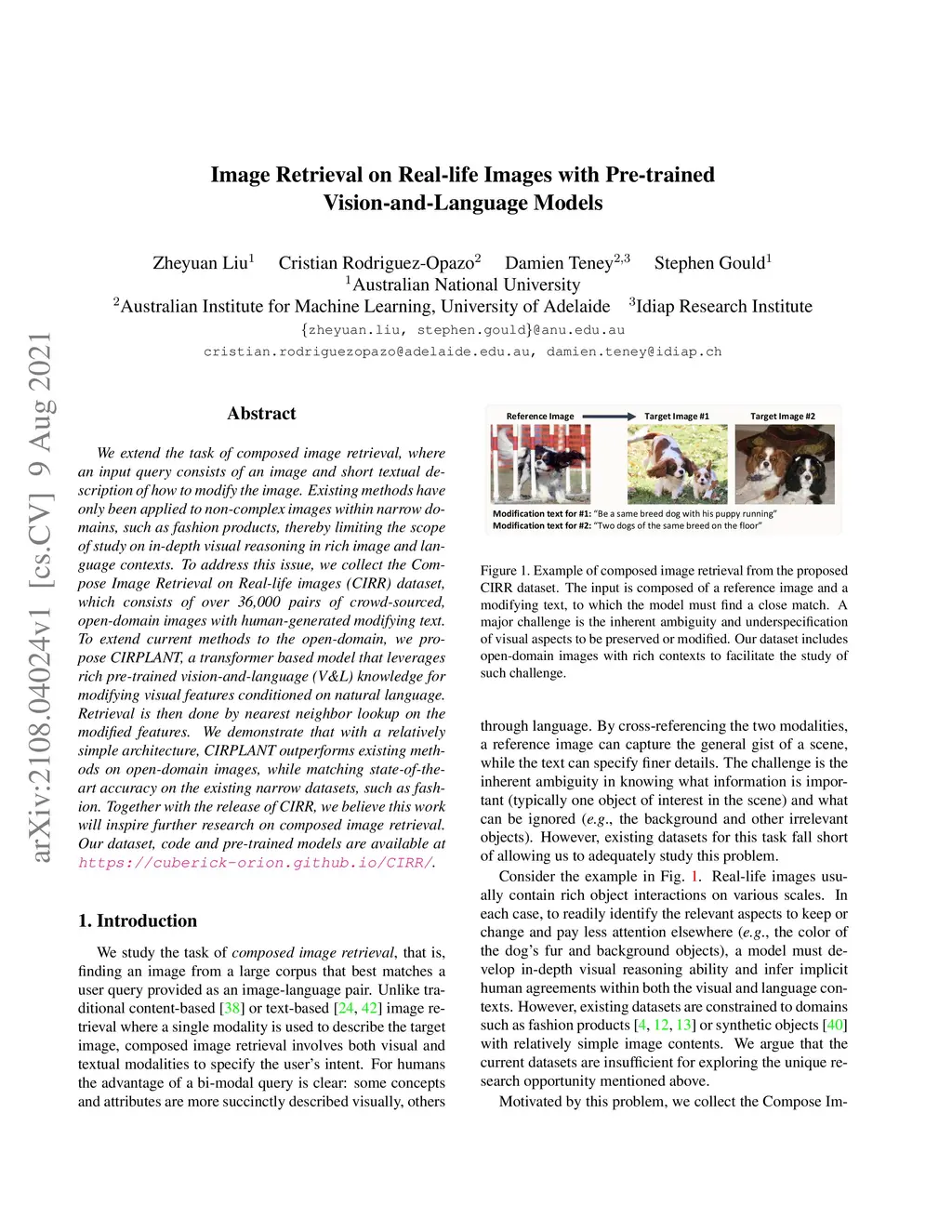 We extend the task of composed image retrieval, where an input query consists of an image and short textual description of how to modify the image. Existing methods have only been applied to non-complex images within narrow domains, such as fashion products, thereby limiting the scope of study on in-depth visual reasoning in rich image and language contexts. To address this issue, we collect the Compose Image Retrieval on Real-life images (CIRR) dataset, which consists of over 36,000 pairs of crowd-sourced, open-domain images with human-generated modifying text. To extend current methods to the open-domain, we propose CIRPLANT, a transformer based model that leverages rich pre-trained vision-and-language (V&L) knowledge for modifying visual features conditioned on natural language. Retrieval is then done by nearest neighbor lookup on the modified features. We demonstrate that with a relatively simple architecture, CIRPLANT outperforms existing methods on open-domain images, while matching state-of-the-art accuracy on the existing narrow datasets, such as fashion. Together with the release of CIRR, we believe this work will inspire further research on composed image retrieval.