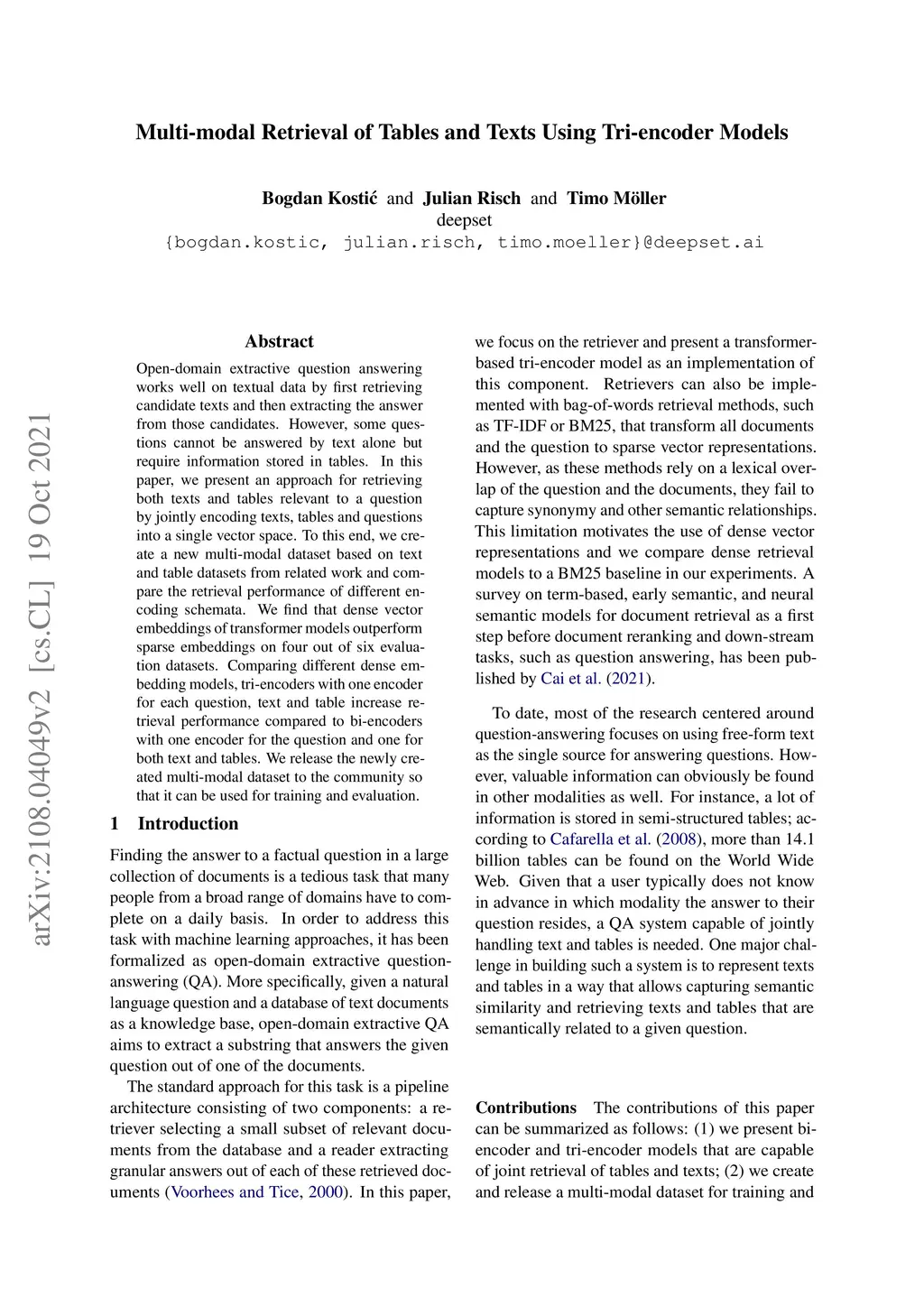 Multi-modal Retrieval of Tables and Texts Using Tri-encoder Models