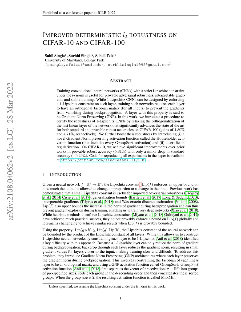 Training convolutional neural networks (CNNs) with a strict Lipschitz constraint under the norm is useful for provable adversarial robustness, interpretable gradients and stable training. While -Lipschitz CNNs can be designed by enforcing a -Lipschitz constraint on each layer, training such networks requires each layer to have an orthogonal Jacobian matrix (for all inputs) to prevent the gradients from vanishing during backpropagation. A layer with this property is said to be Gradient Norm Preserving (GNP). In this work, we introduce a procedure to certify the robustness of -Lipschitz CNNs by relaxing the orthogonalization of the last linear layer of the network that significantly advances the state of the art for both standard and provable robust accuracies on CIFAR-100 (gains of and , respectively). We further boost their robustness by introducing (i) a novel Gradient Norm preserving activation function called the Householder activation function (that includes every activation) and (ii) a certificate regularization. On CIFAR-10, we achieve significant improvements over prior works in provable robust accuracy () with only a minor drop in standard accuracy (). Code for reproducing all experiments in the paper is available at \url{https://github.com/singlasahil14/SOC}.