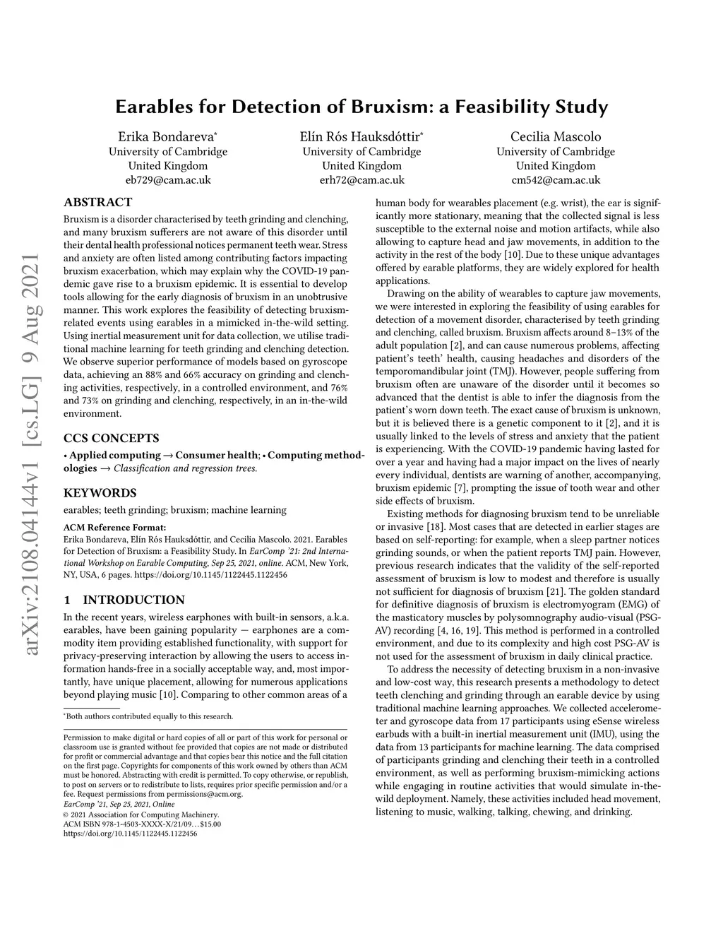 Earables for Detection of Bruxism: a Feasibility Study