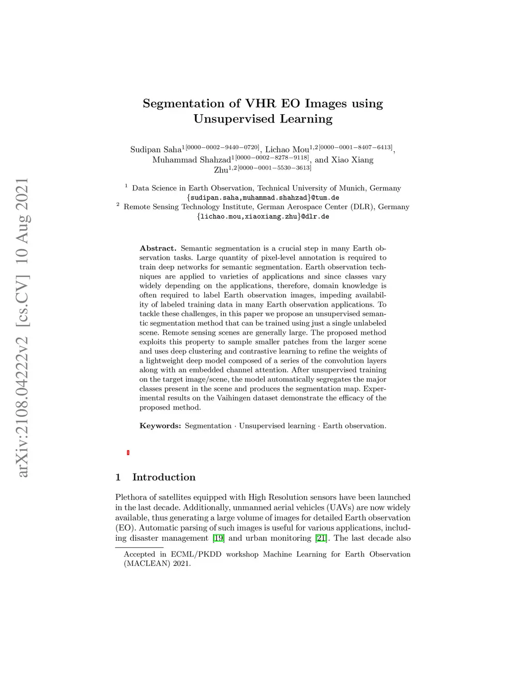Segmentation of VHR EO Images using Unsupervised Learning