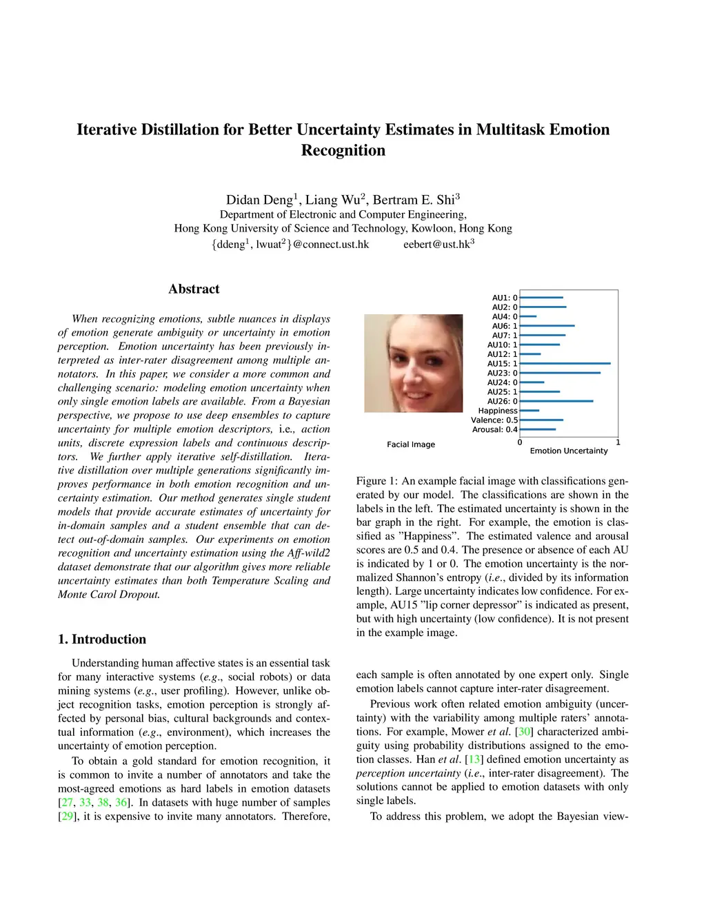 When recognizing emotions, subtle nuances in displays of emotion generate ambiguity or uncertainty in emotion perception. Emotion uncertainty has been previously interpreted as inter-rater disagreement among multiple annotators. In this paper, we consider a more common and challenging scenario: modeling emotion uncertainty when only single emotion labels are available. From a Bayesian perspective, we propose to use deep ensembles to capture uncertainty for multiple emotion descriptors, i.e., action units, discrete expression labels and continuous descriptors. We further apply iterative self-distillation. Iterative distillation over multiple generations significantly improves performance in both emotion recognition and uncertainty estimation. Our method generates single student models that provide accurate estimates of uncertainty for in-domain samples and a student ensemble that can detect out-of-domain samples. Our experiments on emotion recognition and uncertainty estimation using the Aff-wild2 dataset demonstrate that our algorithm gives more reliable uncertainty estimates than both Temperature Scaling and Monte Carol Dropout.