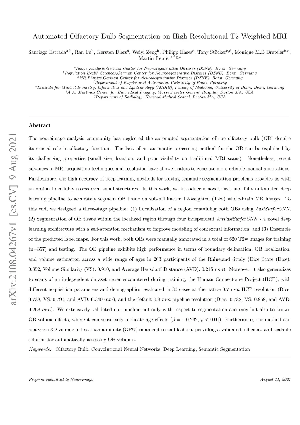 The neuroimage analysis community has neglected the automated segmentation of the olfactory bulb (OB) despite its crucial role in olfactory function. The lack of an automatic processing method for the OB can be explained by its challenging properties. Nonetheless, recent advances in MRI acquisition techniques and resolution have allowed raters to generate more reliable manual annotations. Furthermore, the high accuracy of deep learning methods for solving semantic segmentation problems provides us with an option to reliably assess even small structures. In this work, we introduce a novel, fast, and fully automated deep learning pipeline to accurately segment OB tissue on sub-millimeter T2-weighted (T2w) whole-brain MR images. To this end, we designed a three-stage pipeline: (1) Localization of a region containing both OBs using FastSurferCNN, (2) Segmentation of OB tissue within the localized region through four independent AttFastSurferCNN - a novel deep learning architecture with a self-attention mechanism to improve modeling of contextual information, and (3) Ensemble of the predicted label maps. The OB pipeline exhibits high performance in terms of boundary delineation, OB localization, and volume estimation across a wide range of ages in 203 participants of the Rhineland Study. Moreover, it also generalizes to scans of an independent dataset never encountered during training, the Human Connectome Project (HCP), with different acquisition parameters and demographics, evaluated in 30 cases at the native 0.7mm HCP resolution, and the default 0.8mm pipeline resolution. We extensively validated our pipeline not only with respect to segmentation accuracy but also to known OB volume effects, where it can sensitively replicate age effects.
