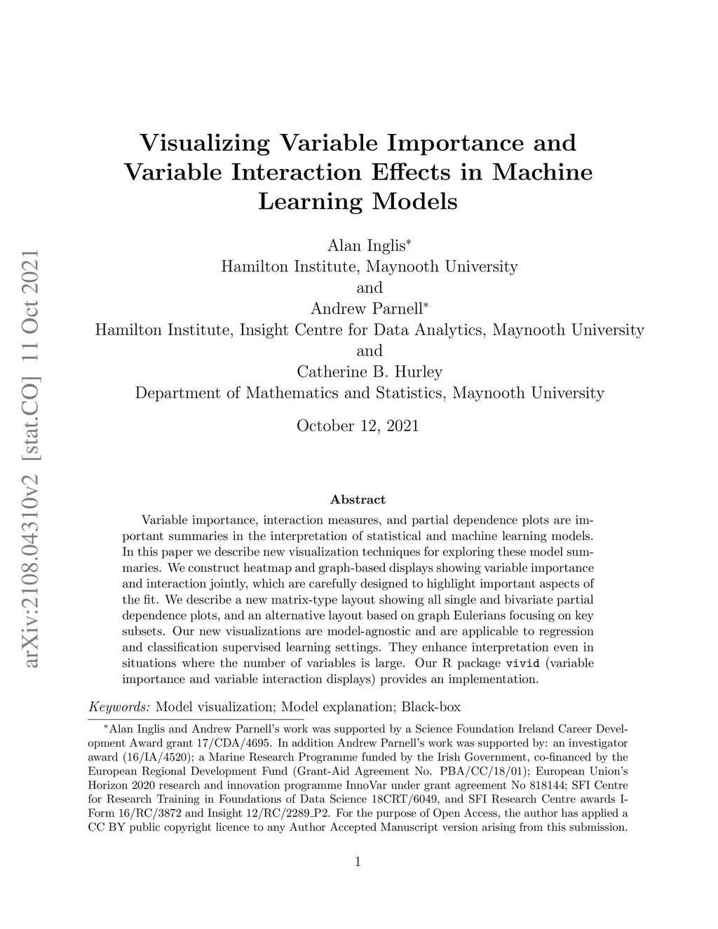 Variable importance, interaction measures, and partial dependence plots are important summaries in the interpretation of statistical and machine learning models. In this paper we describe new visualization techniques for exploring these model summaries. We construct heatmap and graph-based displays showing variable importance and interaction jointly, which are carefully designed to highlight important aspects of the fit. We describe a new matrix-type layout showing all single and bivariate partial dependence plots, and an alternative layout based on graph Eulerians focusing on key subsets. Our new visualizations are model-agnostic and are applicable to regression and classification supervised learning settings. They enhance interpretation even in situations where the number of variables is large. Our R package vivid (variable importance and variable interaction displays) provides an implementation.