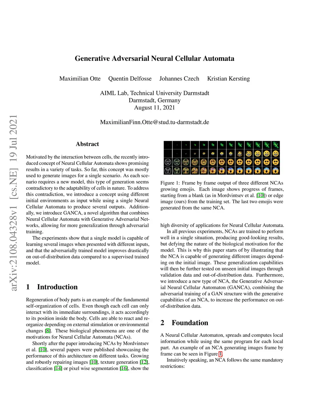 Motivated by the interaction between cells, the recently introduced concept of Neural Cellular Automata shows promising results in a variety of tasks. So far, this concept was mostly used to generate images for a single scenario. As each scenario requires a new model, this type of generation seems contradictory to the adaptability of cells in nature. To address this contradiction, we introduce a concept using different initial environments as input while using a single Neural Cellular Automata to produce several outputs. Additionally, we introduce GANCA, a novel algorithm that combines Neural Cellular Automata with Generative Adversarial Networks, allowing for more generalization through adversarial training. The experiments show that a single model is capable of learning several images when presented with different inputs, and that the adversarially trained model improves drastically on out-of-distribution data compared to a supervised trained model.