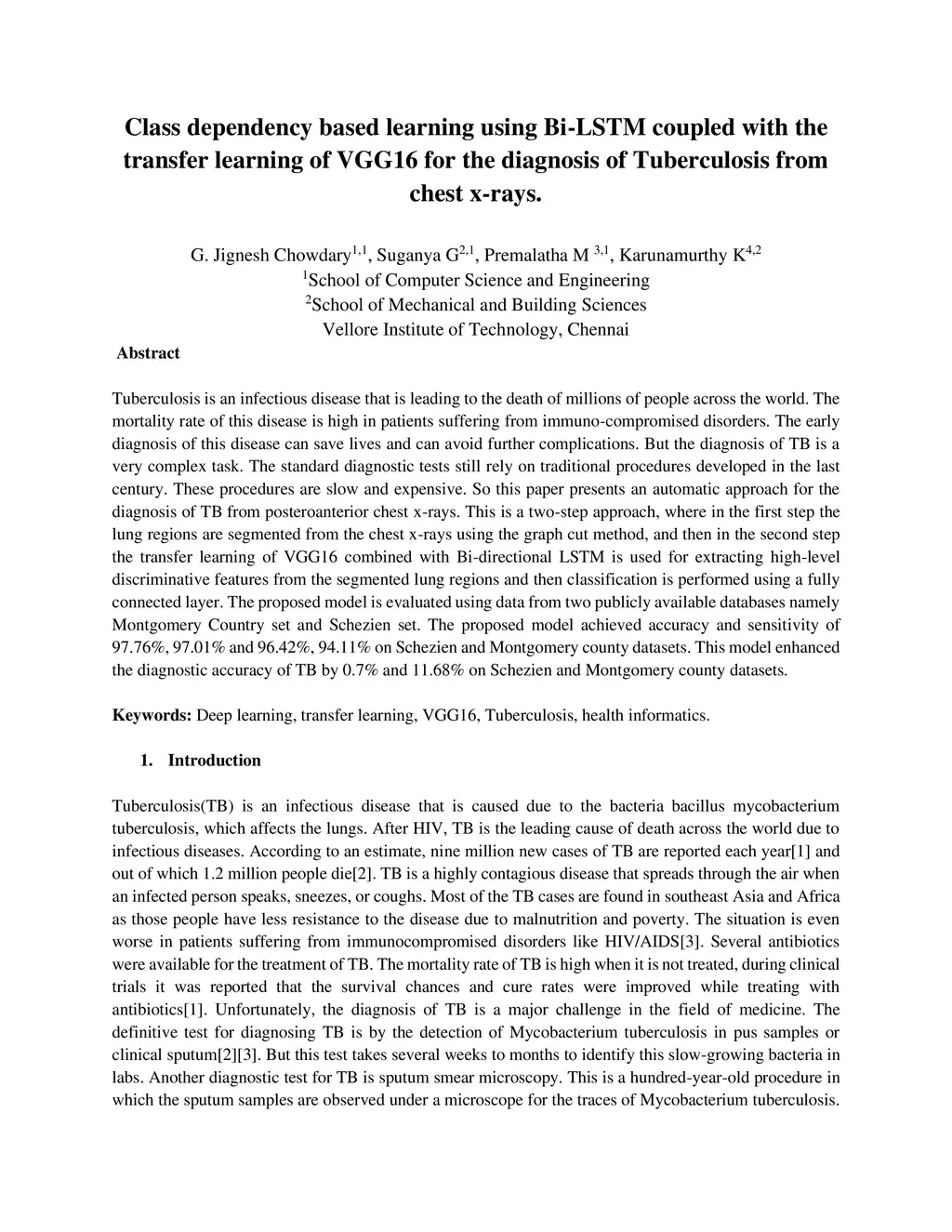 Tuberculosis is an infectious disease that is leading to the death of millions of people across the world. The mortality rate of this disease is high in patients suffering from immuno-compromised disorders. The early diagnosis of this disease can save lives and can avoid further complications. But the diagnosis of TB is a very complex task. The standard diagnostic tests still rely on traditional procedures developed in the last century. These procedures are slow and expensive. So this paper presents an automatic approach for the diagnosis of TB from posteroanterior chest x-rays. This is a two-step approach, where in the first step the lung regions are segmented from the chest x-rays using the graph cut method, and then in the second step the transfer learning of VGG16 combined with Bi-directional LSTM is used for extracting high-level discriminative features from the segmented lung regions and then classification is performed using a fully connected layer. The proposed model is evaluated using data from two publicly available databases namely Montgomery Country set and Schezien set. The proposed model achieved accuracy and sensitivity of 97.76%, 97.01% and 96.42%, 94.11% on Schezien and Montgomery county datasets. This model enhanced the diagnostic accuracy of TB by 0.7% and 11.68% on Schezien and Montgomery county datasets.