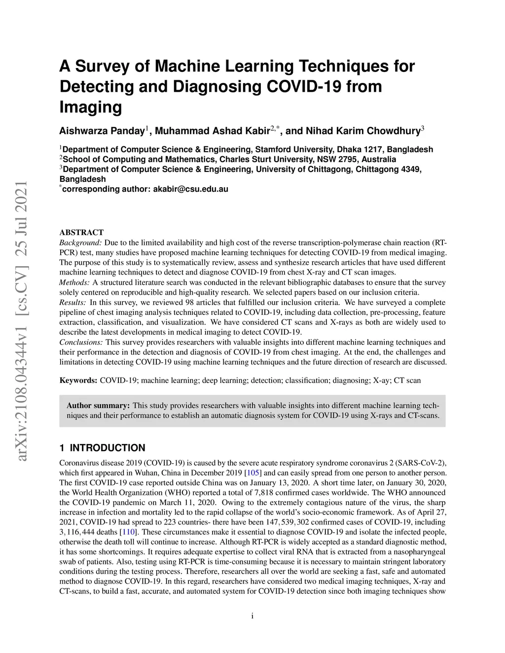 Due to the limited availability and high cost of the reverse transcription-polymerase chain reaction (RT-PCR) test, many studies have proposed machine learning techniques for detecting COVID-19 from medical imaging. The purpose of this study is to systematically review, assess, and synthesize research articles that have used different machine learning techniques to detect and diagnose COVID-19 from chest X-ray and CT scan images. A structured literature search was conducted in the relevant bibliographic databases to ensure that the survey solely centered on reproducible and high-quality research. We selected papers based on our inclusion criteria. In this survey, we reviewed articles that fulfilled our inclusion criteria. We have surveyed a complete pipeline of chest imaging analysis techniques related to COVID-19, including data collection, pre-processing, feature extraction, classification, and visualization. We have considered CT scans and X-rays as both are widely used to describe the latest developments in medical imaging to detect COVID-19. This survey provides researchers with valuable insights into different machine learning techniques and their performance in the detection and diagnosis of COVID-19 from chest imaging. At the end, the challenges and limitations in detecting COVID-19 using machine learning techniques and the future direction of research are discussed.