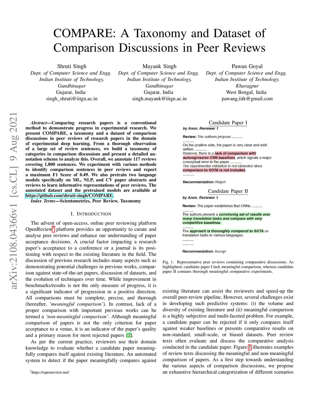 Comparing research papers is a conventional method to demonstrate progress in experimental research. We present COMPARE, a taxonomy and a dataset of comparison discussions in peer reviews of research papers in the domain of experimental deep learning. From a thorough observation of a large set of review sentences, we build a taxonomy of categories in comparison discussions and present a detailed annotation scheme to analyze this. Overall, we annotate 117 reviews covering 1,800 sentences. We experiment with various methods to identify comparison sentences in peer reviews and report a maximum F1 Score of 0.49. We also pretrain two language models specifically on ML, NLP, and CV paper abstracts and reviews to learn informative representations of peer reviews. The annotated dataset and the pretrained models are available at https://github.com/shruti-singh/COMPARE .