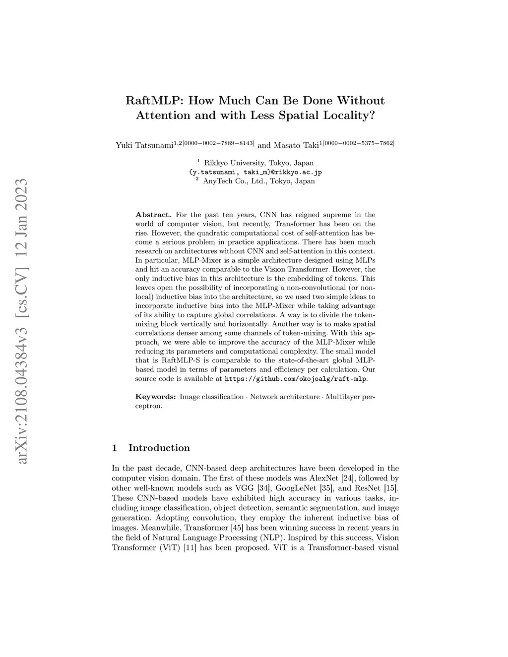 For the past ten years, CNN has reigned supreme in the world of computer vision, but recently, Transformer has been on the rise. However, the quadratic computational cost of self-attention has become a serious problem in practice applications. There has been much research on architectures without CNN and self-attention in this context. In particular, MLP-Mixer is a simple architecture designed using MLPs and hit an accuracy comparable to the Vision Transformer. However, the only inductive bias in this architecture is the embedding of tokens. This leaves open the possibility of incorporating a non-convolutional (or non-local) inductive bias into the architecture, so we used two simple ideas to incorporate inductive bias into the MLP-Mixer while taking advantage of its ability to capture global correlations. A way is to divide the token-mixing block vertically and horizontally. Another way is to make spatial correlations denser among some channels of token-mixing. With this approach, we were able to improve the accuracy of the MLP-Mixer while reducing its parameters and computational complexity. The small model that is RaftMLP-S is comparable to the state-of-the-art global MLP-based model in terms of parameters and efficiency per calculation. In addition, we tackled the problem of fixed input image resolution for global MLP-based models by utilizing bicubic interpolation. We demonstrated that these models could be applied as the backbone of architectures for downstream tasks such as object detection. However, it did not have significant performance and mentioned the need for MLP-specific architectures for downstream tasks for global MLP-based models. The source code in PyTorch version is available at \url{https://github.com/okojoalg/raft-mlp}.