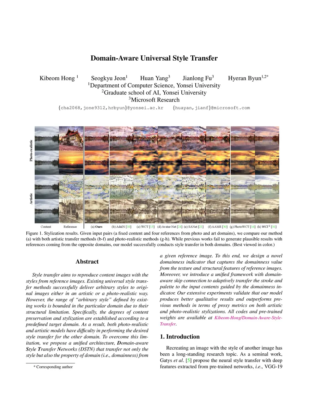 Style transfer aims to reproduce content images with the styles from reference images. Existing universal style transfer methods successfully deliver arbitrary styles to original images either in an artistic or a photo-realistic way. However, the range of árbitrary style' defined by existing works is bounded in the particular domain due to their structural limitation. Specifically, the degrees of content preservation and stylization are established according to a predefined target domain. As a result, both photo-realistic and artistic models have difficulty in performing the desired style transfer for the other domain. To overcome this limitation, we propose a unified architecture, Domain-aware Style Transfer Networks (DSTN) that transfer not only the style but also the property of domain (i.e., domainness) from a given reference image. To this end, we design a novel domainness indicator that captures the domainness value from the texture and structural features of reference images. Moreover, we introduce a unified framework with domain-aware skip connection to adaptively transfer the stroke and palette to the input contents guided by the domainness indicator. Our extensive experiments validate that our model produces better qualitative results and outperforms previous methods in terms of proxy metrics on both artistic and photo-realistic stylizations.