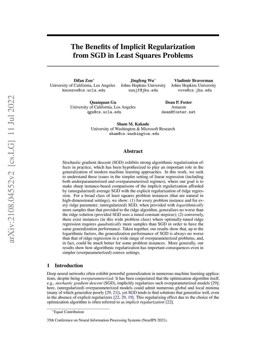 Stochastic gradient descent (SGD) exhibits strong algorithmic regularization effects in practice, which has been hypothesized to play an important role in the generalization of modern machine learning approaches. In this work, we seek to understand these issues in the simpler setting of linear regression (including both underparameterized and overparameterized regimes), where our goal is to make sharp instance-based comparisons of the implicit regularization afforded by (unregularized) average SGD with the explicit regularization of ridge regression. For a broad class of least squares problem instances (that are natural in high-dimensional settings), we show: (1) for every problem instance and for every ridge parameter, (unregularized) SGD, when provided with logarithmically more samples than that provided to the ridge algorithm, generalizes no worse than the ridge solution (provided SGD uses a tuned constant stepsize); (2) conversely, there exist instances (in this wide problem class) where optimally-tuned ridge regression requires quadratically more samples than SGD in order to have the same generalization performance. Taken together, our results show that, up to the logarithmic factors, the generalization performance of SGD is always no worse than that of ridge regression in a wide range of overparameterized problems, and, in fact, could be much better for some problem instances. More generally, our results show how algorithmic regularization has important consequences even in simpler (overparameterized) convex settings.