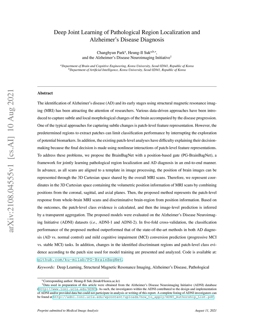 The identification of Alzheimer's disease (AD) and its early stages using structural magnetic resonance imaging (MRI) has been attracting the attention of researchers. Various data-driven approaches have been introduced to capture subtle and local morphological changes of the brain accompanied by the disease progression. One of the typical approaches for capturing subtle changes is patch-level feature representation. However, the predetermined regions to extract patches can limit classification performance by interrupting the exploration of potential biomarkers. In addition, the existing patch-level analyses have difficulty explaining their decision-making. To address these problems, we propose the BrainBagNet with a position-based gate (PG-BrainBagNet), a framework for jointly learning pathological region localization and AD diagnosis in an end-to-end manner. In advance, as all scans are aligned to a template in image processing, the position of brain images can be represented through the 3D Cartesian space shared by the overall MRI scans. The proposed method represents the patch-level response from whole-brain MRI scans and discriminative brain-region from position information. Based on the outcomes, the patch-level class evidence is calculated, and then the image-level prediction is inferred by a transparent aggregation. The proposed models were evaluated on the ADNI datasets. In five-fold cross-validation, the classification performance of the proposed method outperformed that of the state-of-the-art methods in both AD diagnosis (AD vs. normal control) and mild cognitive impairment (MCI) conversion prediction (progressive MCI vs. stable MCI) tasks. In addition, changes in the identified discriminant regions and patch-level class evidence according to the patch size used for model training are presented and analyzed.