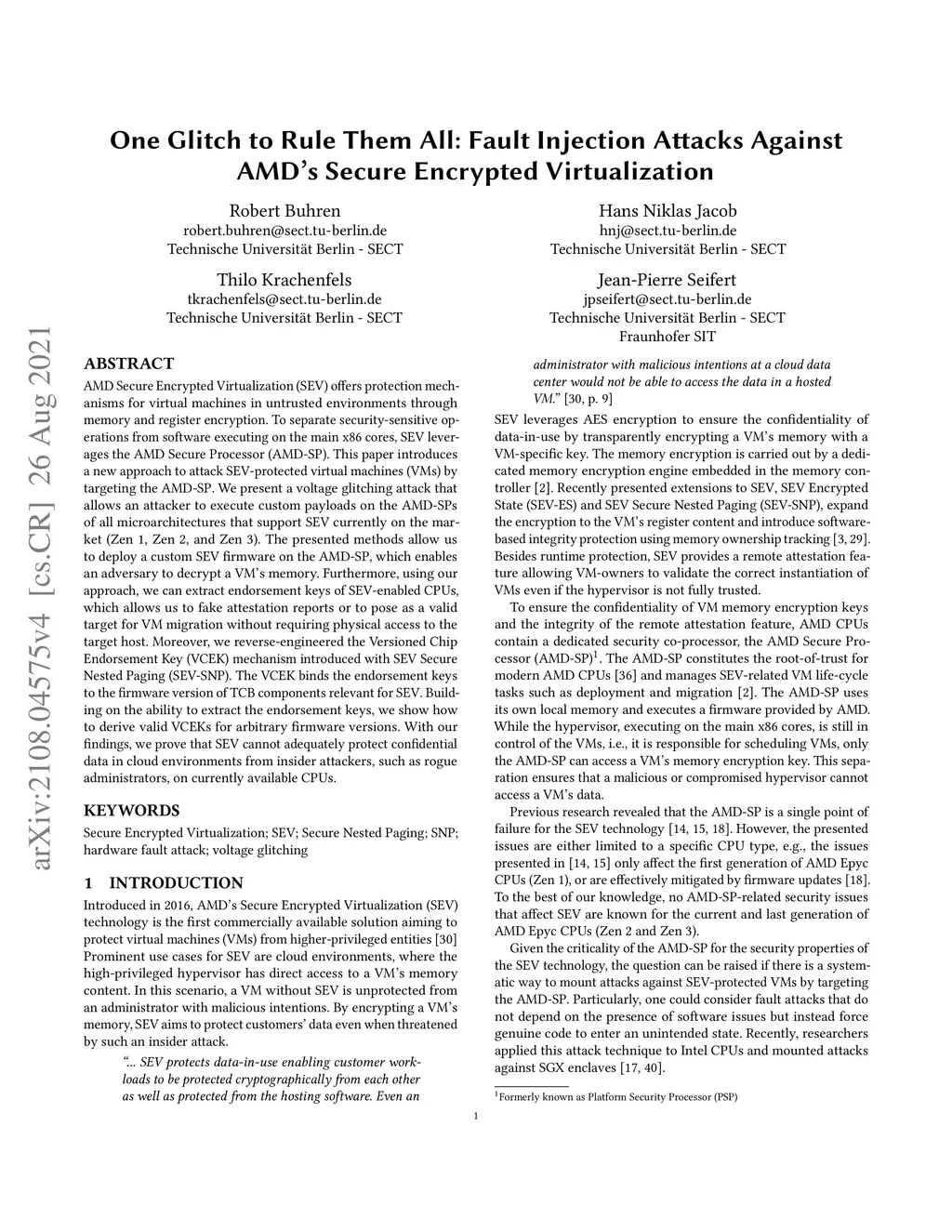AMD Secure Encrypted Virtualization (SEV) offers protection mechanisms for virtual machines in untrusted environments through memory and register encryption. To separate security-sensitive operations from software executing on the main x86 cores, SEV leverages the AMD Secure Processor (AMD-SP). This paper introduces a new approach to attack SEV-protected virtual machines (VMs) by targeting the AMD-SP. We present a voltage glitching attack that allows an attacker to execute custom payloads on the AMD-SPs of all microarchitectures that support SEV currently on the market (Zen 1, Zen 2, and Zen 3). The presented methods allow us to deploy a custom SEV firmware on the AMD-SP, which enables an adversary to decrypt a VM's memory. Furthermore, using our approach, we can extract endorsement keys of SEV-enabled CPUs, which allows us to fake attestation reports or to pose as a valid target for VM migration without requiring physical access to the target host. Moreover, we reverse-engineered the Versioned Chip Endorsement Key (VCEK) mechanism introduced with SEV Secure Nested Paging (SEV-SNP). The VCEK binds the endorsement keys to the firmware version of TCB components relevant for SEV. Building on the ability to extract the endorsement keys, we show how to derive valid VCEKs for arbitrary firmware versions. With our findings, we prove that SEV cannot adequately protect confidential data in cloud environments from insider attackers, such as rogue administrators, on currently available CPUs.