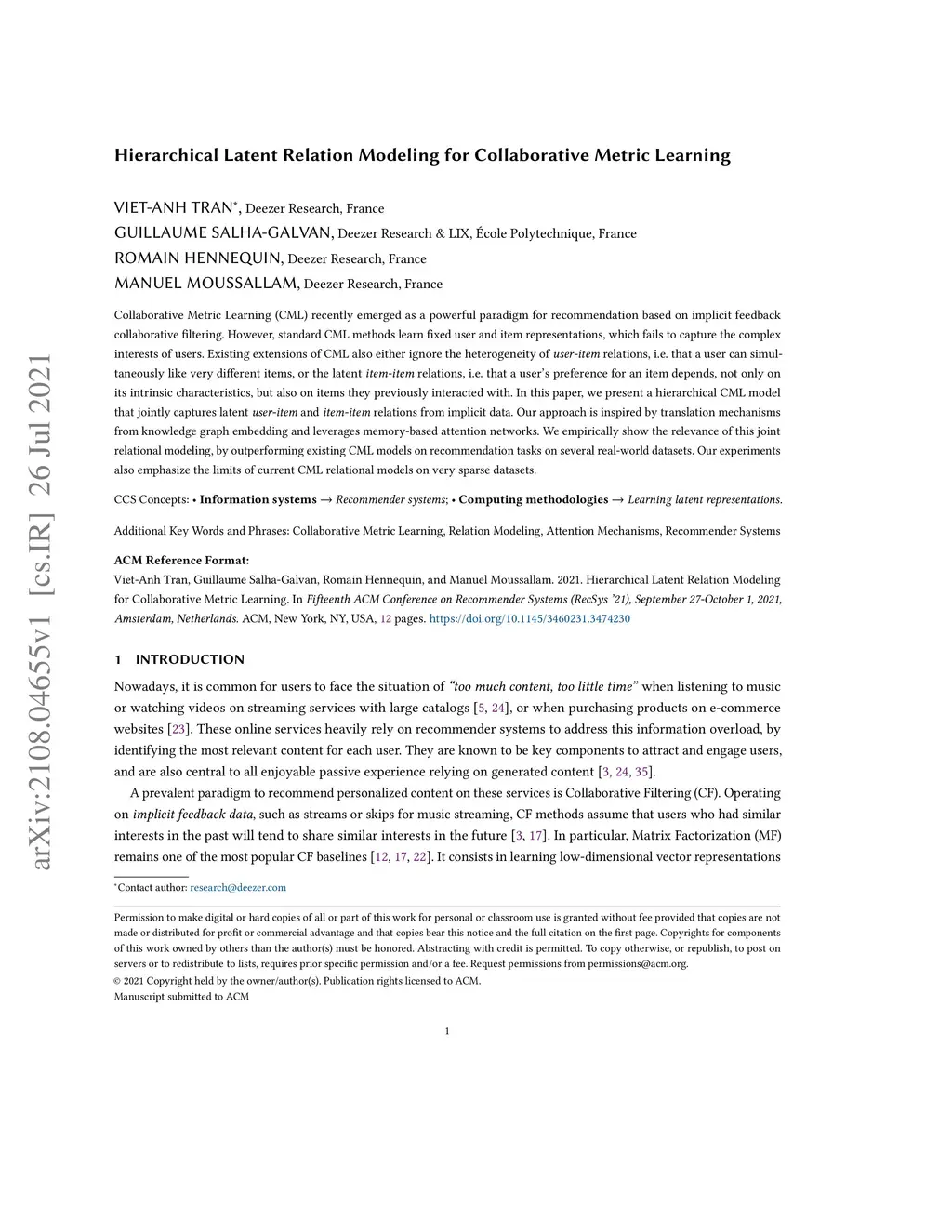 Hierarchical Latent Relation Modeling for Collaborative Metric Learning