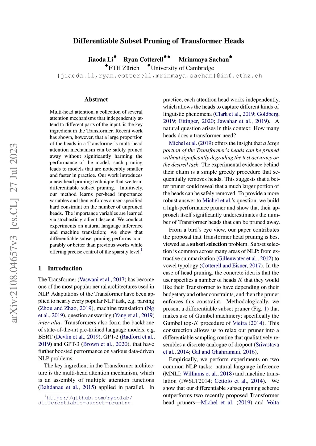Differentiable Subset Pruning of Transformer Heads