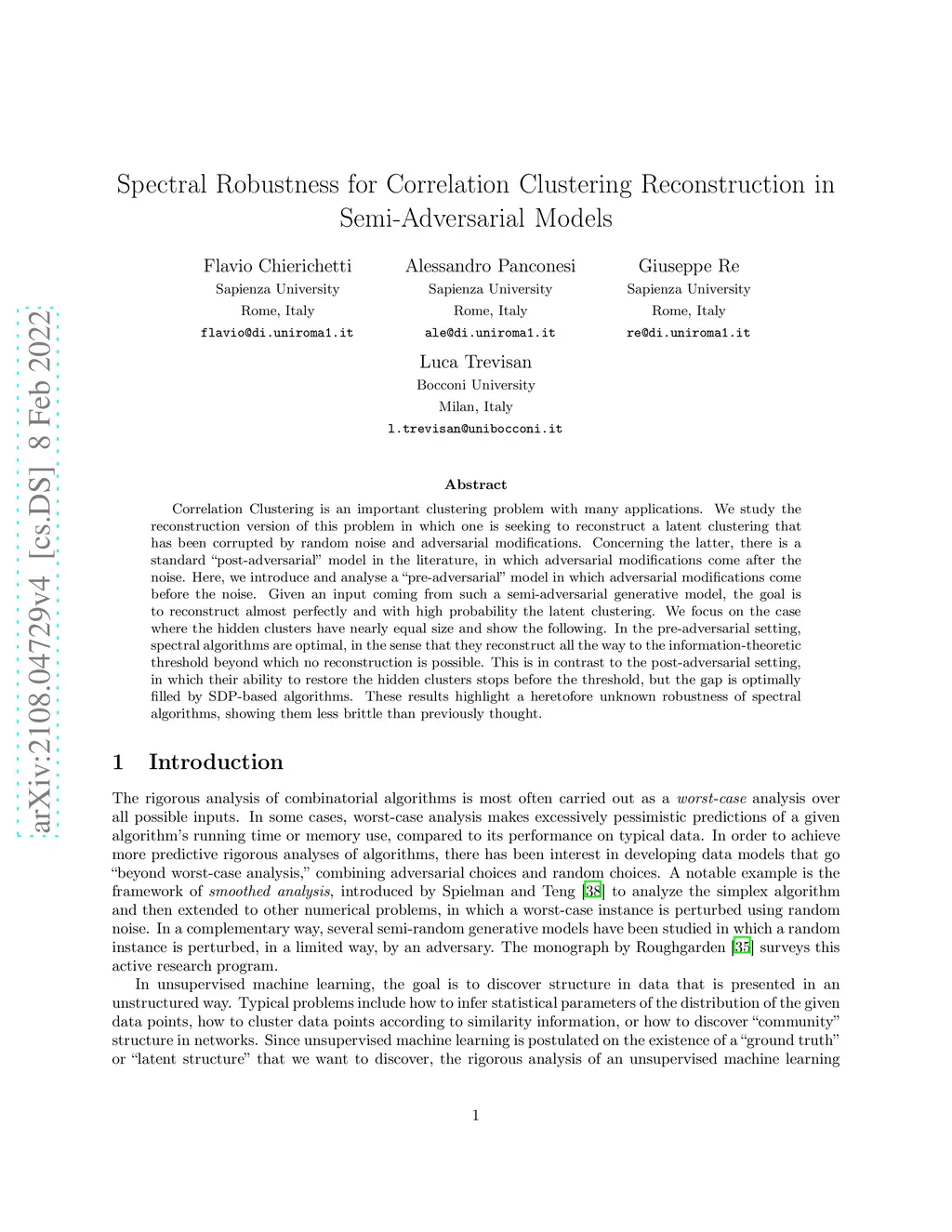 Correlation Clustering is an important clustering problem with many applications. We study the reconstruction version of this problem in which one is seeking to reconstruct a latent clustering that has been corrupted by random noise and adversarial modifications. Concerning the latter, there is a standard "post-adversarial" model in the literature, in which adversarial modifications come after the noise. Here, we introduce and analyse a "pre-adversarial" model in which adversarial modifications come before the noise. Given an input coming from such a semi-adversarial generative model, the goal is to reconstruct almost perfectly and with high probability the latent clustering. We focus on the case where the hidden clusters have nearly equal size and show the following. In the pre-adversarial setting, spectral algorithms are optimal, in the sense that they reconstruct all the way to the information-theoretic threshold beyond which no reconstruction is possible. This is in contrast to the post-adversarial setting, in which their ability to restore the hidden clusters stops before the threshold, but the gap is optimally filled by SDP-based algorithms. These results highlight a heretofore unknown robustness of spectral algorithms, showing them less brittle than previously thought.