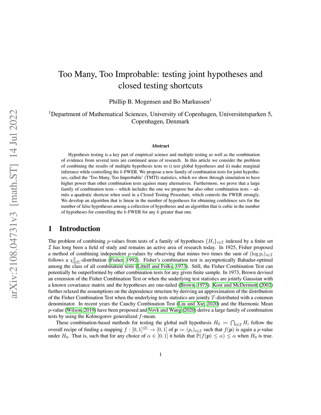 Hypothesis testing is a key part of empirical science and multiple testing as well as the combination of evidence from several tests are continued areas of research. In this article we consider the problem of combining the results of multiple hypothesis tests to i) test global hypotheses and ii) make marginal inference while controlling the k-FWER. We propose a new family of combination tests for joint hypotheses, which we show through simulation to have higher power than other combination tests against many alternatives. Furthermore, we prove that a large family of combination tests -- which includes the one we propose but also other combination tests -- admits a quadratic shortcut when used in a \CTP, which controls the FWER strongly. We develop an algorithm that is linear in the number of hypotheses for obtaining confidence sets for the number of false hypotheses among a collection of hypotheses and an algorithm that is cubic in the number of hypotheses for controlling the k-FWER for any k greater than one.