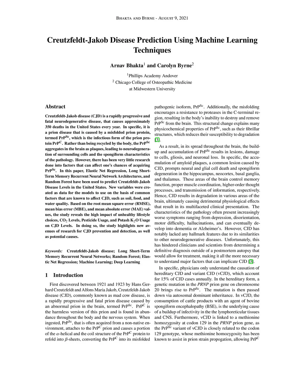 Creutzfeldt-Jakob disease (CJD) is a rapidly progressive and fatal neurodegenerative disease, that causes approximately 350 deaths in the United States every year. In specific, it is a prion disease that is caused by a misfolded prion protein, termed , which is the infectious form of the prion protein . Rather than being recycled by the body, the aggregates in the brain as plaques, leading to neurodegeneration of surrounding cells and the spongiform characteristics of the pathology. However, there has been very little research done into factors that can affect one's chances of acquiring . In this paper, Elastic Net Regression, Long Short-Term Memory Recurrent Neural Network Architectures, and Random Forest have been used to predict Creutzfeldt-Jakob Disease Levels in the United States. New variables were created as data for the models to use on the basis of common factors that are known to affect CJD, such as soil, food, and water quality. Based on the root mean square error (RMSE), mean bias error (MBE), and mean absolute error (MAE) values, the study reveals the high impact of unhealthy lifestyle choices, CO Levels, Pesticide Usage, and Potash KO Usage on CJD Levels. In doing so, the study highlights new avenues of research for CJD prevention and detection, as well as potential causes.