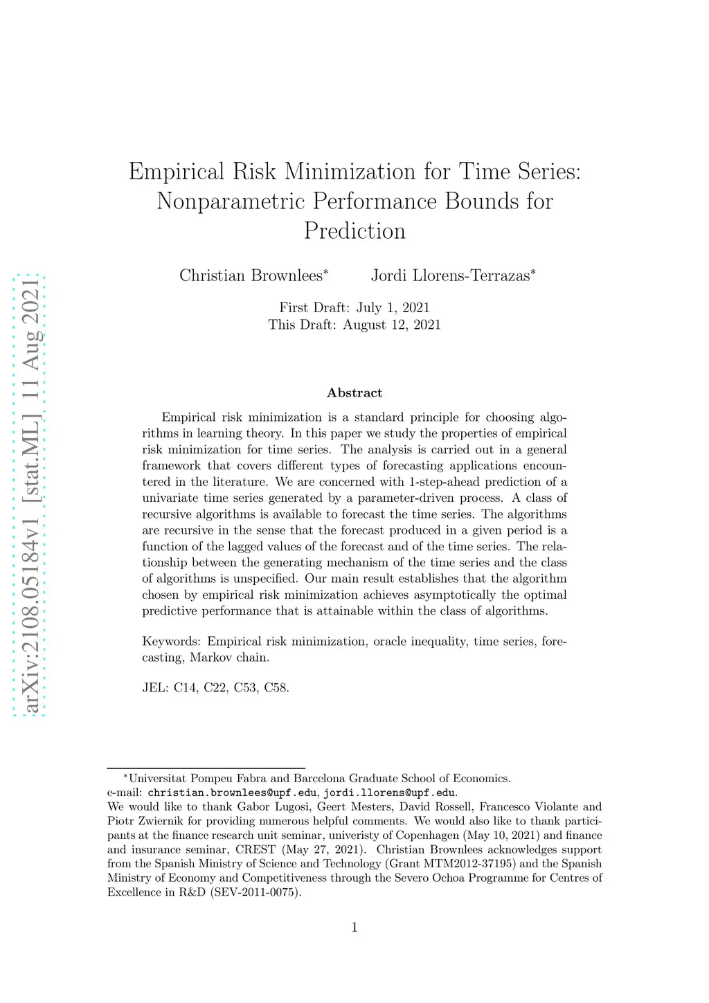 Empirical risk minimization is a standard principle for choosing algorithms in learning theory. In this paper we study the properties of empirical risk minimization for time series. The analysis is carried out in a general framework that covers different types of forecasting applications encountered in the literature. We are concerned with 1-step-ahead prediction of a univariate time series generated by a parameter-driven process. A class of recursive algorithms is available to forecast the time series. The algorithms are recursive in the sense that the forecast produced in a given period is a function of the lagged values of the forecast and of the time series. The relationship between the generating mechanism of the time series and the class of algorithms is unspecified. Our main result establishes that the algorithm chosen by empirical risk minimization achieves asymptotically the optimal predictive performance that is attainable within the class of algorithms.