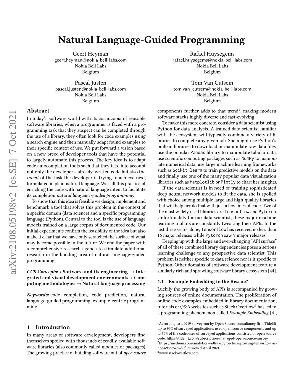 In today's software world with its cornucopia of reusable software libraries, when a programmer is faced with a programming task that they suspect can be completed through the use of a library, they often look for code examples using a search engine and then manually adapt found examples to their specific context of use. We put forward a vision based on a new breed of developer tools that have the potential to largely automate this process. The key idea is to adapt code autocompletion tools such that they take into account not only the developer's already-written code but also the intent of the task the developer is trying to achieve next, formulated in plain natural language. We call this practice of enriching the code with natural language intent to facilitate its completion natural language-guided programming. To show that this idea is feasible we design, implement and benchmark a tool that solves this problem in the context of a specific domain (data science) and a specific programming language (Python). Central to the tool is the use of language models trained on a large corpus of documented code. Our initial experiments confirm the feasibility of the idea but also make it clear that we have only scratched the surface of what may become possible in the future. We end the paper with a comprehensive research agenda to stimulate additional research in the budding area of natural language-guided programming.