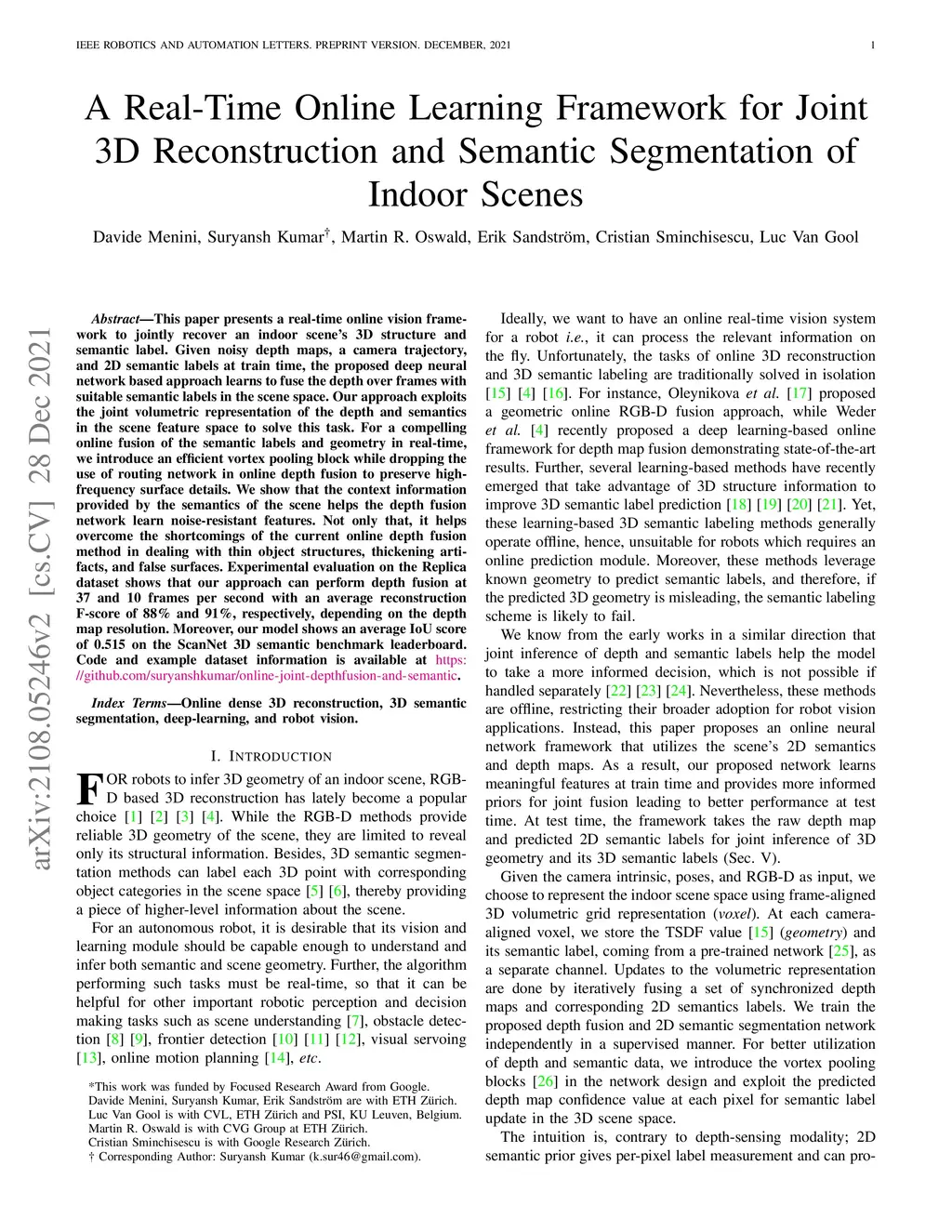 This paper presents a real-time online vision framework to jointly recover an indoor scene's 3D structure and semantic label. Given noisy depth maps, a camera trajectory, and 2D semantic labels at train time, the proposed deep neural network based approach learns to fuse the depth over frames with suitable semantic labels in the scene space. Our approach exploits the joint volumetric representation of the depth and semantics in the scene feature space to solve this task. For a compelling online fusion of the semantic labels and geometry in real-time, we introduce an efficient vortex pooling block while dropping the use of routing network in online depth fusion to preserve high-frequency surface details. We show that the context information provided by the semantics of the scene helps the depth fusion network learn noise-resistant features. Not only that, it helps overcome the shortcomings of the current online depth fusion method in dealing with thin object structures, thickening artifacts, and false surfaces. Experimental evaluation on the Replica dataset shows that our approach can perform depth fusion at 37 and 10 frames per second with an average reconstruction F-score of 88% and 91%, respectively, depending on the depth map resolution. Moreover, our model shows an average IoU score of 0.515 on the ScanNet 3D semantic benchmark leaderboard.
