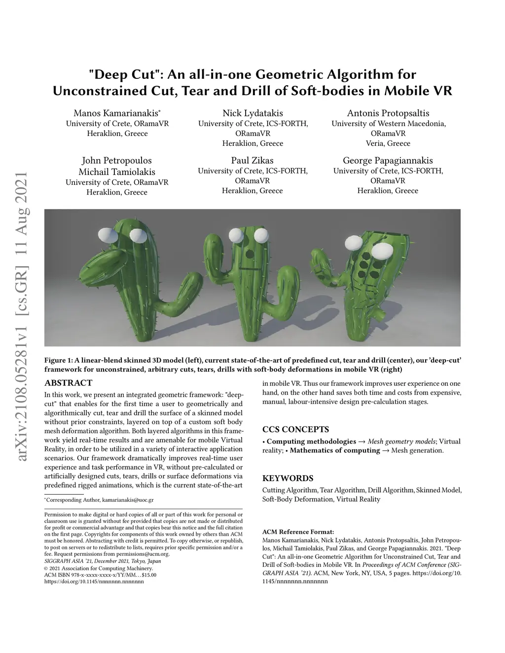 In this work, we present an integrated geometric framework: "deep- cut" that enables for the first time a user to geometrically and algorithmically cut, tear and drill the surface of a skinned model without prior constraints, layered on top of a custom soft body mesh deformation algorithm. Both layered algorithms in this frame- work yield real-time results and are amenable for mobile Virtual Reality, in order to be utilized in a variety of interactive application scenarios. Our framework dramatically improves real-time user experience and task performance in VR, without pre-calculated or artificially designed cuts, tears, drills or surface deformations via predefined rigged animations, which is the current state-of-the-art in mobile VR. Thus our framework improves user experience on one hand, on the other hand saves both time and costs from expensive, manual, labour-intensive design pre-calculation stages.