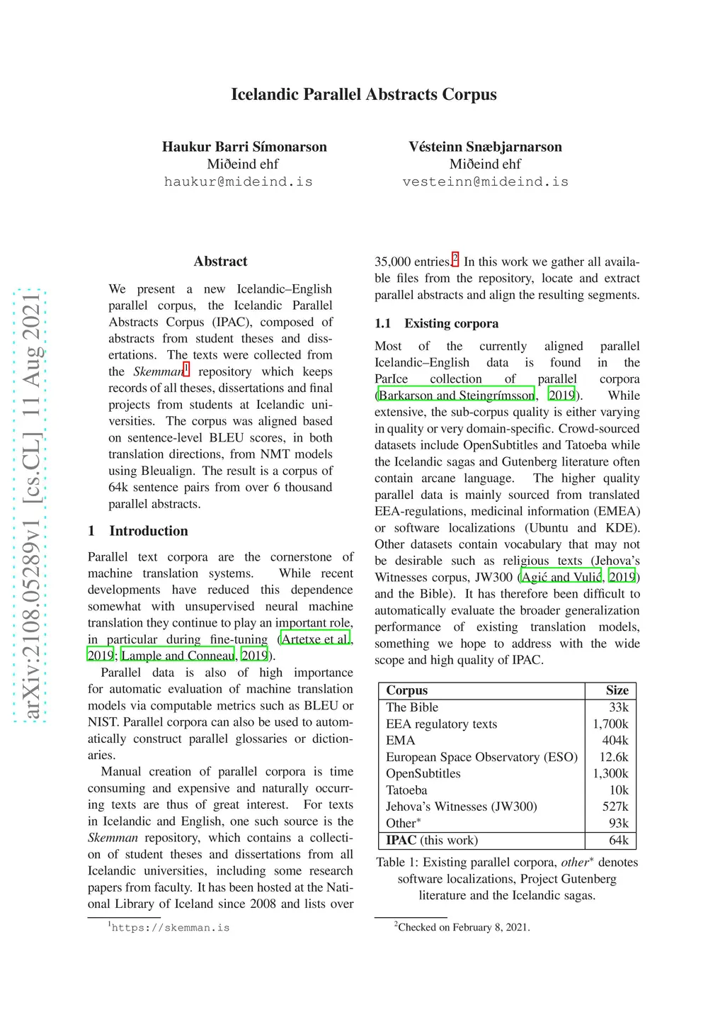 We present a new Icelandic-English parallel corpus, the Icelandic Parallel Abstracts Corpus (IPAC), composed of abstracts from student theses and dissertations. The texts were collected from the Skemman repository which keeps records of all theses, dissertations and final projects from students at Icelandic universities. The corpus was aligned based on sentence-level BLEU scores, in both translation directions, from NMT models using Bleualign. The result is a corpus of 64k sentence pairs from over 6 thousand parallel abstracts.