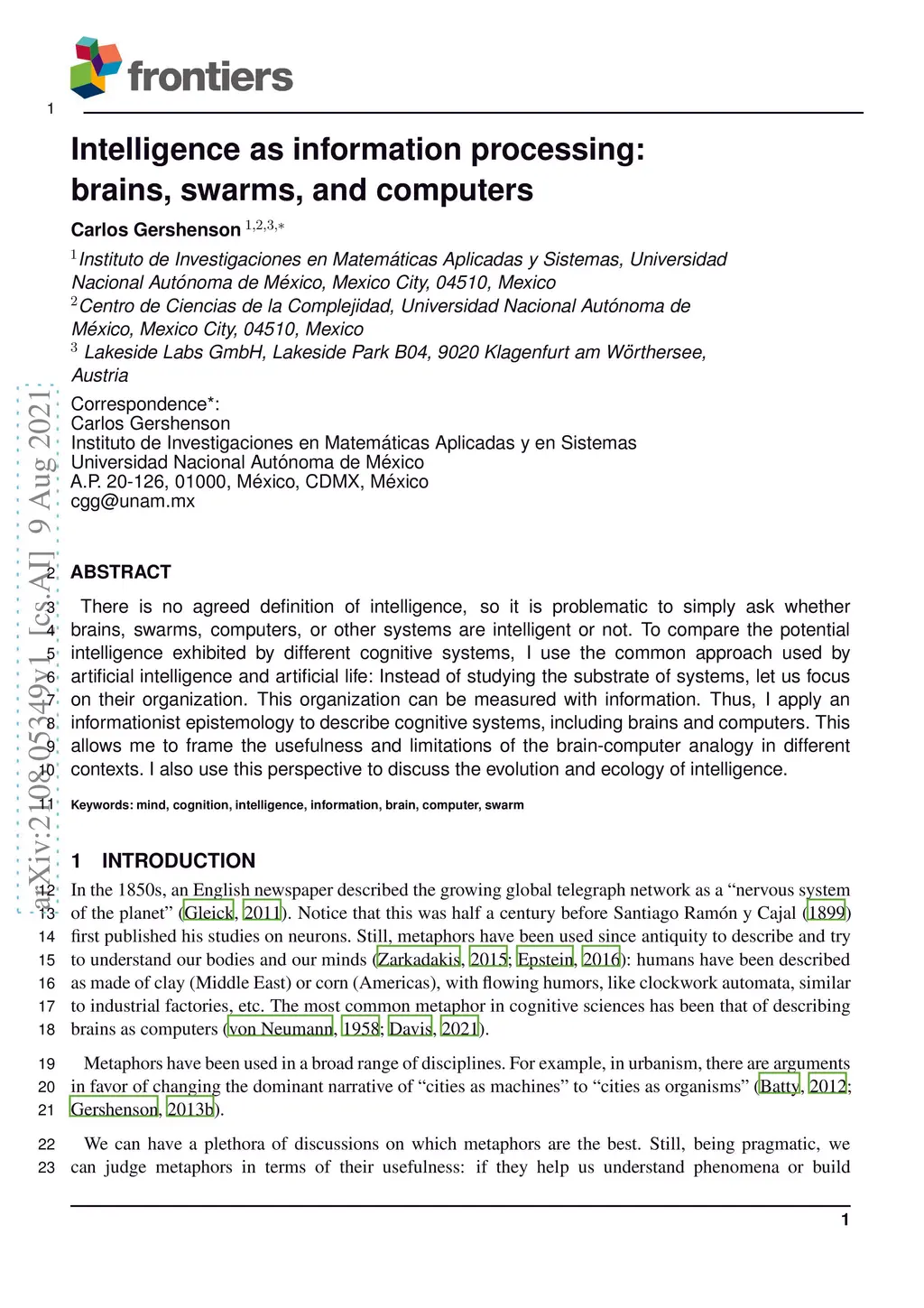 There is no agreed definition of intelligence, so it is problematic to simply ask whether brains, swarms, computers, or other systems are intelligent or not. To compare the potential intelligence exhibited by different cognitive systems, I use the common approach used by artificial intelligence and artificial life: Instead of studying the substrate of systems, let us focus on their organization. This organization can be measured with information. Thus, I apply an informationist epistemology to describe cognitive systems, including brains and computers. This allows me to frame the usefulness and limitations of the brain-computer analogy in different contexts. I also use this perspective to discuss the evolution and ecology of intelligence.