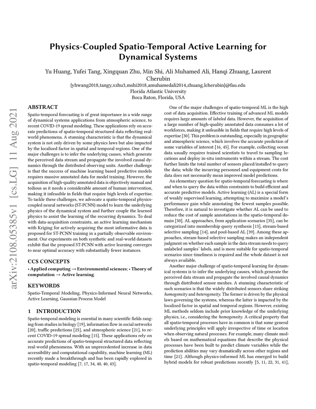 Spatio-temporal forecasting is of great importance in a wide range of dynamical systems applications from atmospheric science, to recent COVID-19 spread modeling. These applications rely on accurate predictions of spatio-temporal structured data reflecting real-world phenomena. A stunning characteristic is that the dynamical system is not only driven by some physics laws but also impacted by the localized factor in spatial and temporal regions. One of the major challenges is to infer the underlying causes, which generate the perceived data stream and propagate the involved causal dynamics through the distributed observing units. Another challenge is that the success of machine learning based predictive models requires massive annotated data for model training. However, the acquisition of high-quality annotated data is objectively manual and tedious as it needs a considerable amount of human intervention, making it infeasible in fields that require high levels of expertise. To tackle these challenges, we advocate a spatio-temporal physics-coupled neural networks (ST-PCNN) model to learn the underlying physics of the dynamical system and further couple the learned physics to assist the learning of the recurring dynamics. To deal with data-acquisition constraints, an active learning mechanism with Kriging for actively acquiring the most informative data is proposed for ST-PCNN training in a partially observable environment. Our experiments on both synthetic and real-world datasets exhibit that the proposed ST-PCNN with active learning converges to near optimal accuracy with substantially fewer instances.