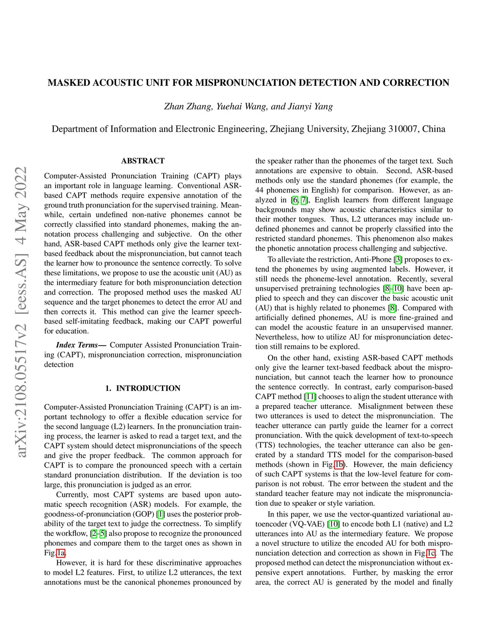 Computer-Assisted Pronunciation Training (CAPT) plays an important role in language learning. Conventional ASR-based CAPT methods require expensive annotation of the ground truth pronunciation for the supervised training. Meanwhile, certain undefined non-native phonemes cannot be correctly classified into standard phonemes, making the annotation process challenging and subjective. On the other hand, ASR-based CAPT methods only give the learner text-based feedback about the mispronunciation, but cannot teach the learner how to pronounce the sentence correctly. To solve these limitations, we propose to use the acoustic unit (AU) as the intermediary feature for both mispronunciation detection and correction. The proposed method uses the masked AU sequence and the target phonemes to detect the error AU and then corrects it. This method can give the learner speech-based self-imitating feedback, making our CAPT powerful for education.
