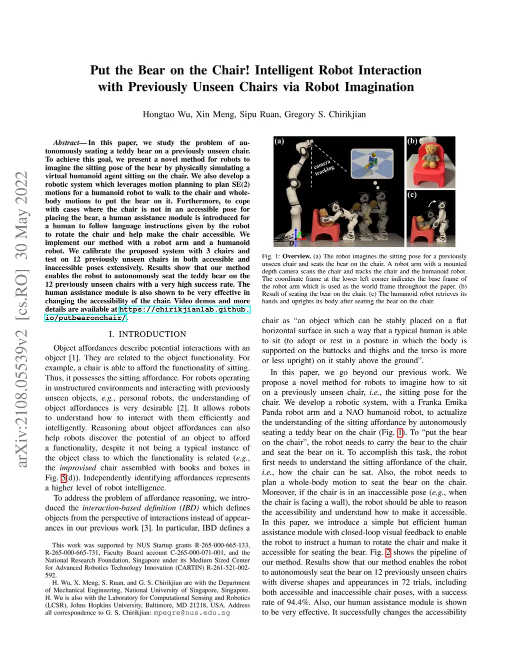 In this paper, we study the problem of autonomously seating a teddy bear on a previously unseen chair. To achieve this goal, we present a novel method for robots to imagine the sitting pose of the bear by physically simulating a virtual humanoid agent sitting on the chair. We also develop a robotic system which leverages motion planning to plan SE(2) motions for a humanoid robot to walk to the chair and whole-body motions to put the bear on it. Furthermore, to cope with cases where the chair is not in an accessible pose for placing the bear, a human assistance module is introduced for a human to follow language instructions given by the robot to rotate the chair and help make the chair accessible. We implement our method with a robot arm and a humanoid robot. We calibrate the proposed system with 3 chairs and test on 12 previously unseen chairs in both accessible and inaccessible poses extensively. Results show that our method enables the robot to autonomously seat the teddy bear on the 12 previously unseen chairs with a very high success rate. The human assistance module is also shown to be very effective in changing the accessibility of the chair. Video demos and more details are available at https://chirikjianlab.github.io/putbearonchair/.