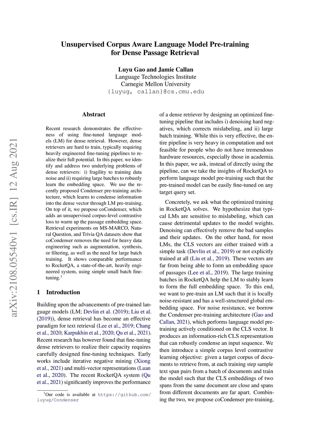 Unsupervised Corpus Aware Language Model Pre-training for Dense Passage