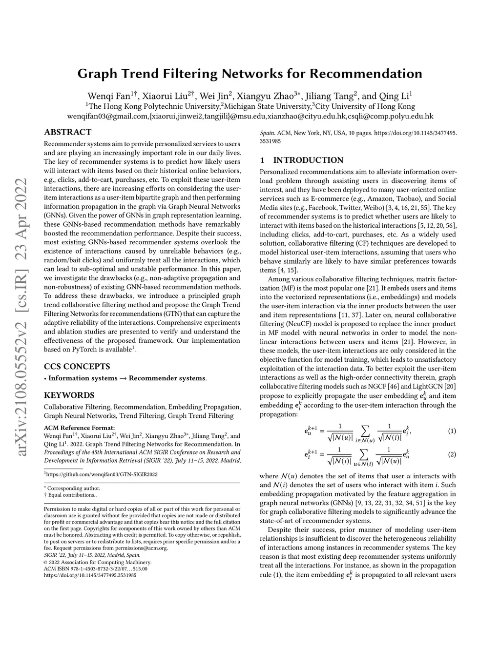 Recommender systems aim to provide personalized services to users and are playing an increasingly important role in our daily lives. The key of recommender systems is to predict how likely users will interact with items based on their historical online behaviors, e.g., clicks, add-to-cart, purchases, etc. To exploit these user-item interactions, there are increasing efforts on considering the user-item interactions as a user-item bipartite graph and then performing information propagation in the graph via Graph Neural Networks (GNNs). Given the power of GNNs in graph representation learning, these GNNs-based recommendation methods have remarkably boosted the recommendation performance. Despite their success, most existing GNNs-based recommender systems overlook the existence of interactions caused by unreliable behaviors (e.g., random/bait clicks) and uniformly treat all the interactions, which can lead to sub-optimal and unstable performance. In this paper, we investigate the drawbacks (e.g., non-adaptive propagation and non-robustness) of existing GNN-based recommendation methods. To address these drawbacks, we introduce a principled graph trend collaborative filtering method and propose the Graph Trend Filtering Networks for recommendations (GTN) that can capture the adaptive reliability of the interactions. Comprehensive experiments and ablation studies are presented to verify and understand the effectiveness of the proposed framework. Our implementation based on PyTorch is available at https://github.com/wenqifan03/GTN-SIGIR2022.
