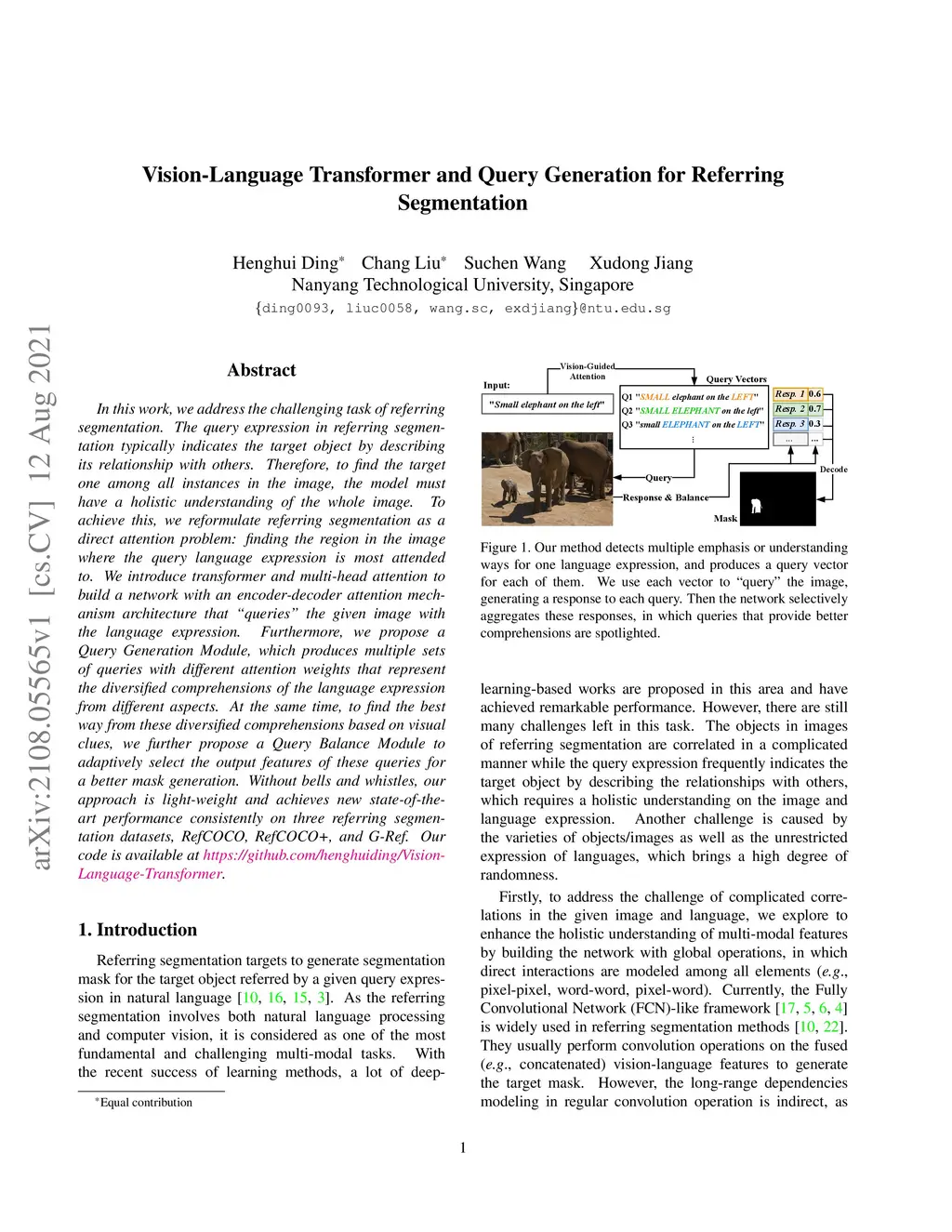 In this work, we address the challenging task of referring segmentation. The query expression in referring segmentation typically indicates the target object by describing its relationship with others. Therefore, to find the target one among all instances in the image, the model must have a holistic understanding of the whole image. To achieve this, we reformulate referring segmentation as a direct attention problem: finding the region in the image where the query language expression is most attended to. We introduce transformer and multi-head attention to build a network with an encoder-decoder attention mechanism architecture that "queries" the given image with the language expression. Furthermore, we propose a Query Generation Module, which produces multiple sets of queries with different attention weights that represent the diversified comprehensions of the language expression from different aspects. At the same time, to find the best way from these diversified comprehensions based on visual clues, we further propose a Query Balance Module to adaptively select the output features of these queries for a better mask generation. Without bells and whistles, our approach is light-weight and achieves new state-of-the-art performance consistently on three referring segmentation datasets, RefCOCO, RefCOCO+, and G-Ref. Our code is available at https://github.com/henghuiding/Vision-Language-Transformer.