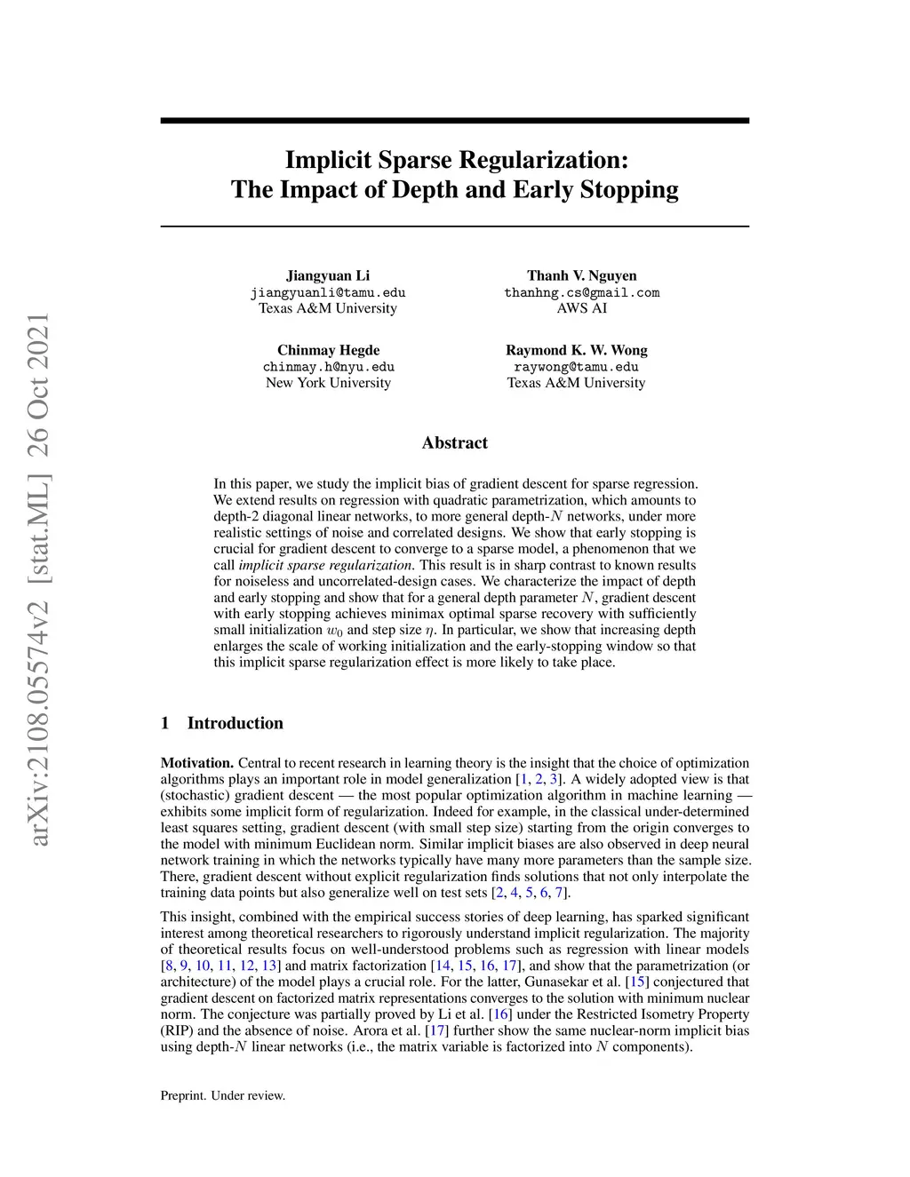 In this paper, we study the implicit bias of gradient descent for sparse regression. We extend results on regression with quadratic parametrization, which amounts to depth-2 diagonal linear networks, to more general depth-N networks, under more realistic settings of noise and correlated designs. We show that early stopping is crucial for gradient descent to converge to a sparse model, a phenomenon that we call implicit sparse regularization. This result is in sharp contrast to known results for noiseless and uncorrelated-design cases. We characterize the impact of depth and early stopping and show that for a general depth parameter N, gradient descent with early stopping achieves minimax optimal sparse recovery with sufficiently small initialization and step size. In particular, we show that increasing depth enlarges the scale of working initialization and the early-stopping window so that this implicit sparse regularization effect is more likely to take place.
