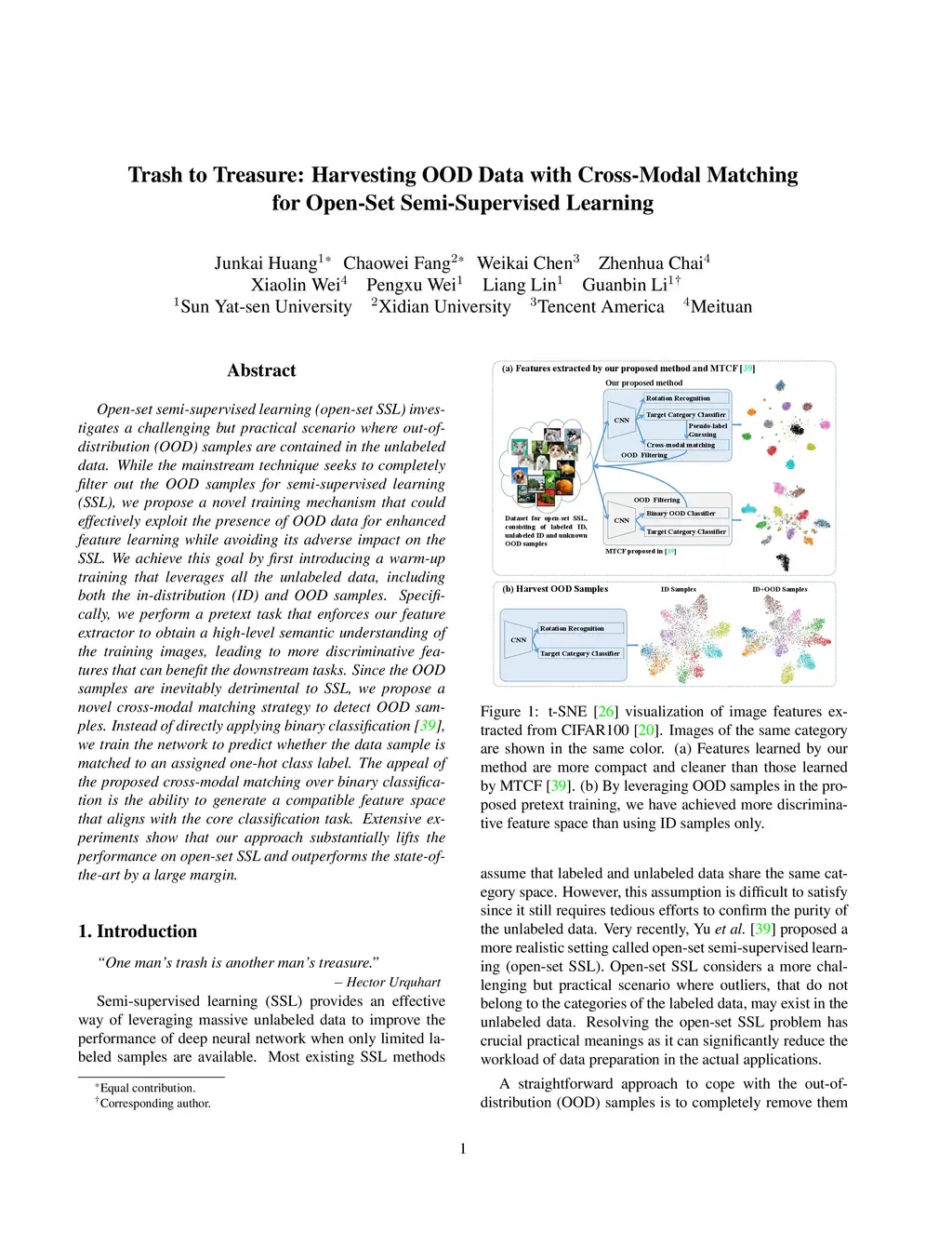 Open-set semi-supervised learning (open-set SSL) investigates a challenging but practical scenario where out-of-distribution (OOD) samples are contained in the unlabeled data. While the mainstream technique seeks to completely filter out the OOD samples for semi-supervised learning (SSL), we propose a novel training mechanism that could effectively exploit the presence of OOD data for enhanced feature learning while avoiding its adverse impact on the SSL. We achieve this goal by first introducing a warm-up training that leverages all the unlabeled data, including both the in-distribution (ID) and OOD samples. Specifically, we perform a pretext task that enforces our feature extractor to obtain a high-level semantic understanding of the training images, leading to more discriminative features that can benefit the downstream tasks. Since the OOD samples are inevitably detrimental to SSL, we propose a novel cross-modal matching strategy to detect OOD samples. Instead of directly applying binary classification, we train the network to predict whether the data sample is matched to an assigned one-hot class label. The appeal of the proposed cross-modal matching over binary classification is the ability to generate a compatible feature space that aligns with the core classification task. Extensive experiments show that our approach substantially lifts the performance on open-set SSL and outperforms the state-of-the-art by a large margin.