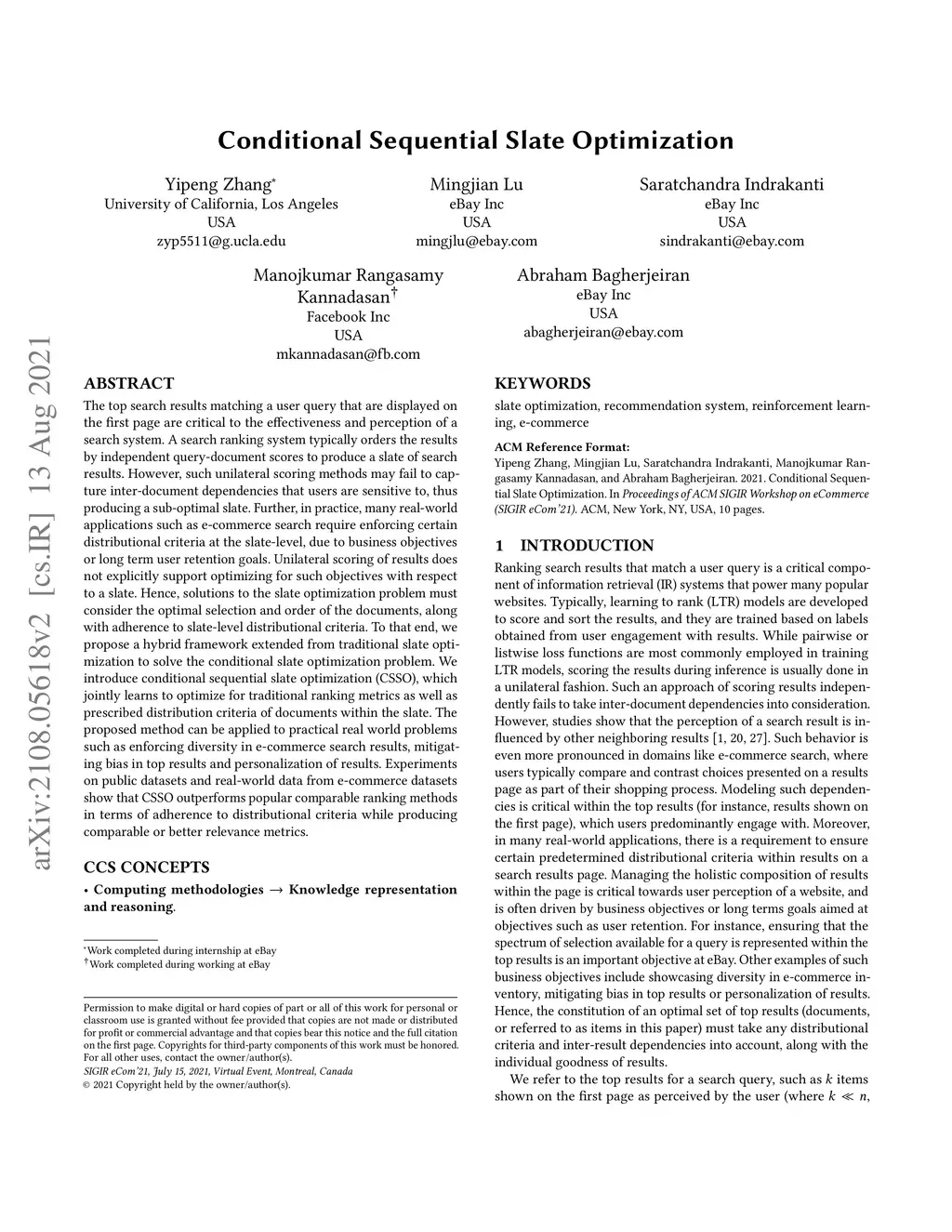 The top search results matching a user query that are displayed on the first page are critical to the effectiveness and perception of a search system. A search ranking system typically orders the results by independent query-document scores to produce a slate of search results. However, such unilateral scoring methods may fail to capture inter-document dependencies that users are sensitive to, thus producing a sub-optimal slate. Further, in practice, many real-world applications such as e-commerce search require enforcing certain distributional criteria at the slate-level, due to business objectives or long term user retention goals. Unilateral scoring of results does not explicitly support optimizing for such objectives with respect to a slate. Hence, solutions to the slate optimization problem must consider the optimal selection and order of the documents, along with adherence to slate-level distributional criteria. To that end, we propose a hybrid framework extended from traditional slate optimization to solve the conditional slate optimization problem. We introduce conditional sequential slate optimization (CSSO), which jointly learns to optimize for traditional ranking metrics as well as prescribed distribution criteria of documents within the slate. The proposed method can be applied to practical real world problems such as enforcing diversity in e-commerce search results, mitigating bias in top results and personalization of results. Experiments on public datasets and real-world data from e-commerce datasets show that CSSO outperforms popular comparable ranking methods in terms of adherence to distributional criteria while producing comparable or better relevance metrics.