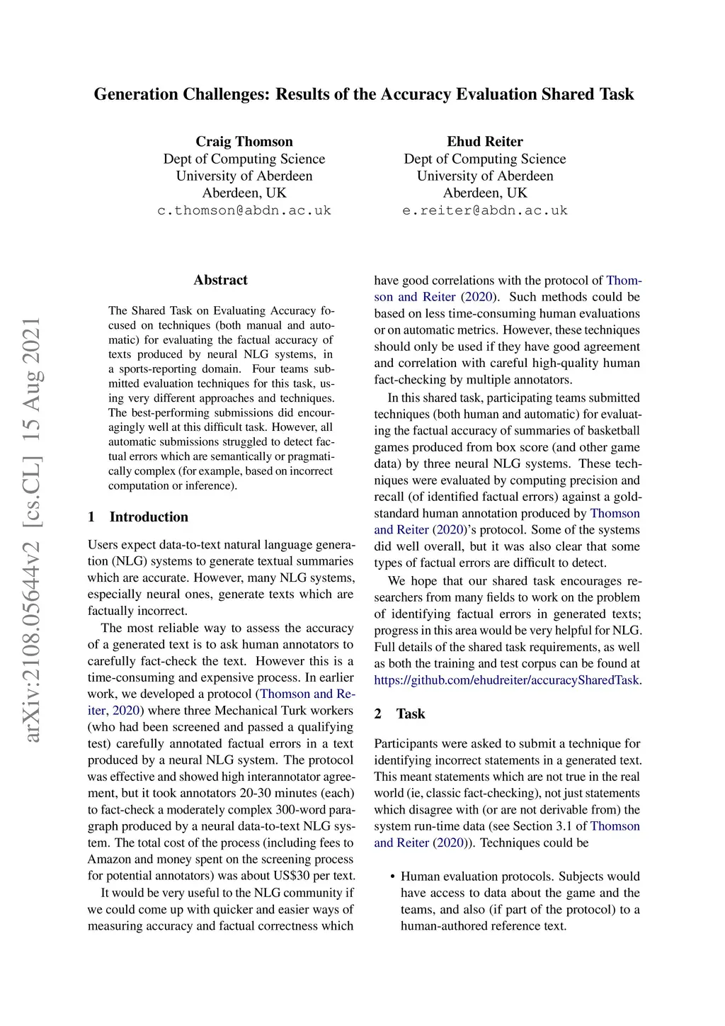 The Shared Task on Evaluating Accuracy focused on techniques (both manual and automatic) for evaluating the factual accuracy of texts produced by neural NLG systems, in a sports-reporting domain. Four teams submitted evaluation techniques for this task, using very different approaches and techniques. The best-performing submissions did encouragingly well at this difficult task. However, all automatic submissions struggled to detect factual errors which are semantically or pragmatically complex (for example, based on incorrect computation or inference).