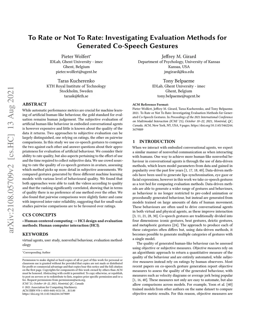 While automatic performance metrics are crucial for machine learning of artificial human-like behaviour, the gold standard for evaluation remains human judgement. The subjective evaluation of artificial human-like behaviour in embodied conversational agents is however expensive and little is known about the quality of the data it returns. Two approaches to subjective evaluation can be largely distinguished, one relying on ratings, the other on pairwise comparisons. In this study we use co-speech gestures to compare the two against each other and answer questions about their appropriateness for evaluation of artificial behaviour. We consider their ability to rate quality, but also aspects pertaining to the effort of use and the time required to collect subjective data. We use crowd sourcing to rate the quality of co-speech gestures in avatars, assessing which method picks up more detail in subjective assessments. We compared gestures generated by three different machine learning models with various level of behavioural quality. We found that both approaches were able to rank the videos according to quality and that the ranking significantly correlated, showing that in terms of quality there is no preference of one method over the other. We also found that pairwise comparisons were slightly faster and came with improved inter-rater reliability, suggesting that for small-scale studies pairwise comparisons are to be favoured over ratings.