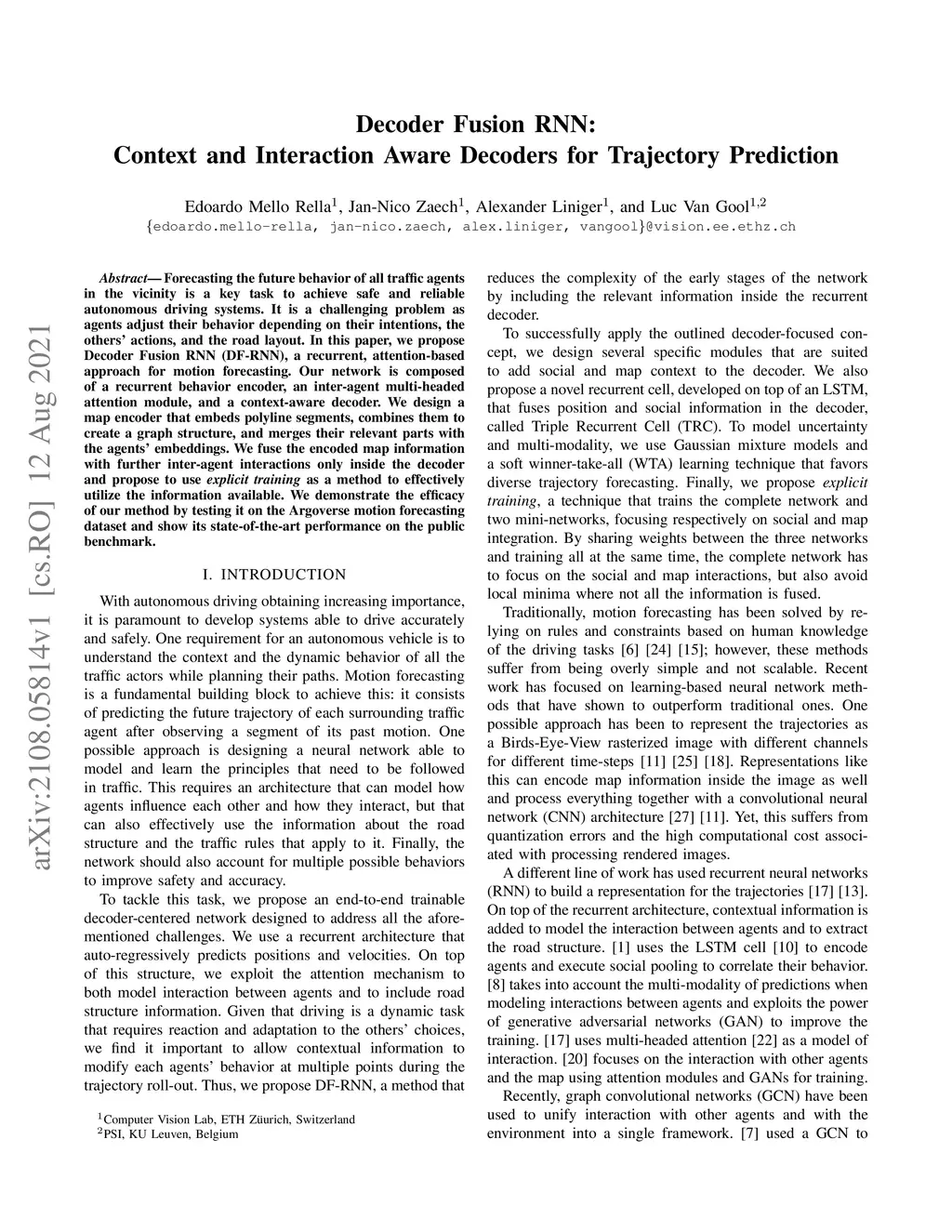Forecasting the future behavior of all traffic agents in the vicinity is a key task to achieve safe and reliable autonomous driving systems. It is a challenging problem as agents adjust their behavior depending on their intentions, the others' actions, and the road layout. In this paper, we propose Decoder Fusion RNN (DF-RNN), a recurrent, attention-based approach for motion forecasting. Our network is composed of a recurrent behavior encoder, an inter-agent multi-headed attention module, and a context-aware decoder. We design a map encoder that embeds polyline segments, combines them to create a graph structure, and merges their relevant parts with the agents' embeddings. We fuse the encoded map information with further inter-agent interactions only inside the decoder and propose to use explicit training as a method to effectively utilize the information available. We demonstrate the efficacy of our method by testing it on the Argoverse motion forecasting dataset and show its state-of-the-art performance on the public benchmark.