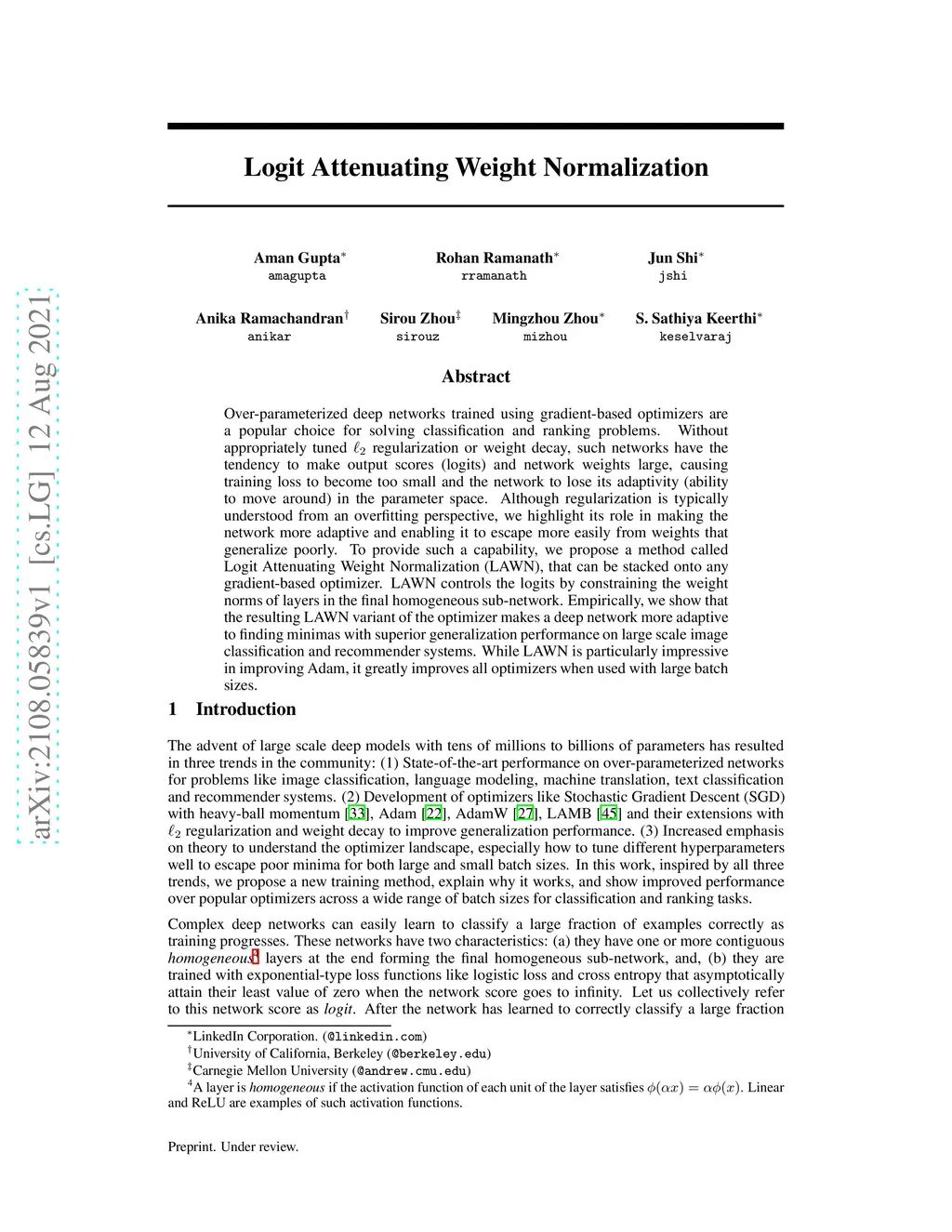 Over-parameterized deep networks trained using gradient-based optimizers are a popular choice for solving classification and ranking problems. Without appropriately tuned regularization or weight decay, such networks have the tendency to make output scores (logits) and network weights large, causing training loss to become too small and the network to lose its adaptivity (ability to move around) in the parameter space. Although regularization is typically understood from an overfitting perspective, we highlight its role in making the network more adaptive and enabling it to escape more easily from weights that generalize poorly. To provide such a capability, we propose a method called Logit Attenuating Weight Normalization (LAWN), that can be stacked onto any gradient-based optimizer. LAWN controls the logits by constraining the weight norms of layers in the final homogeneous sub-network. Empirically, we show that the resulting LAWN variant of the optimizer makes a deep network more adaptive to finding minimas with superior generalization performance on large-scale image classification and recommender systems. While LAWN is particularly impressive in improving Adam, it greatly improves all optimizers when used with large batch sizes
