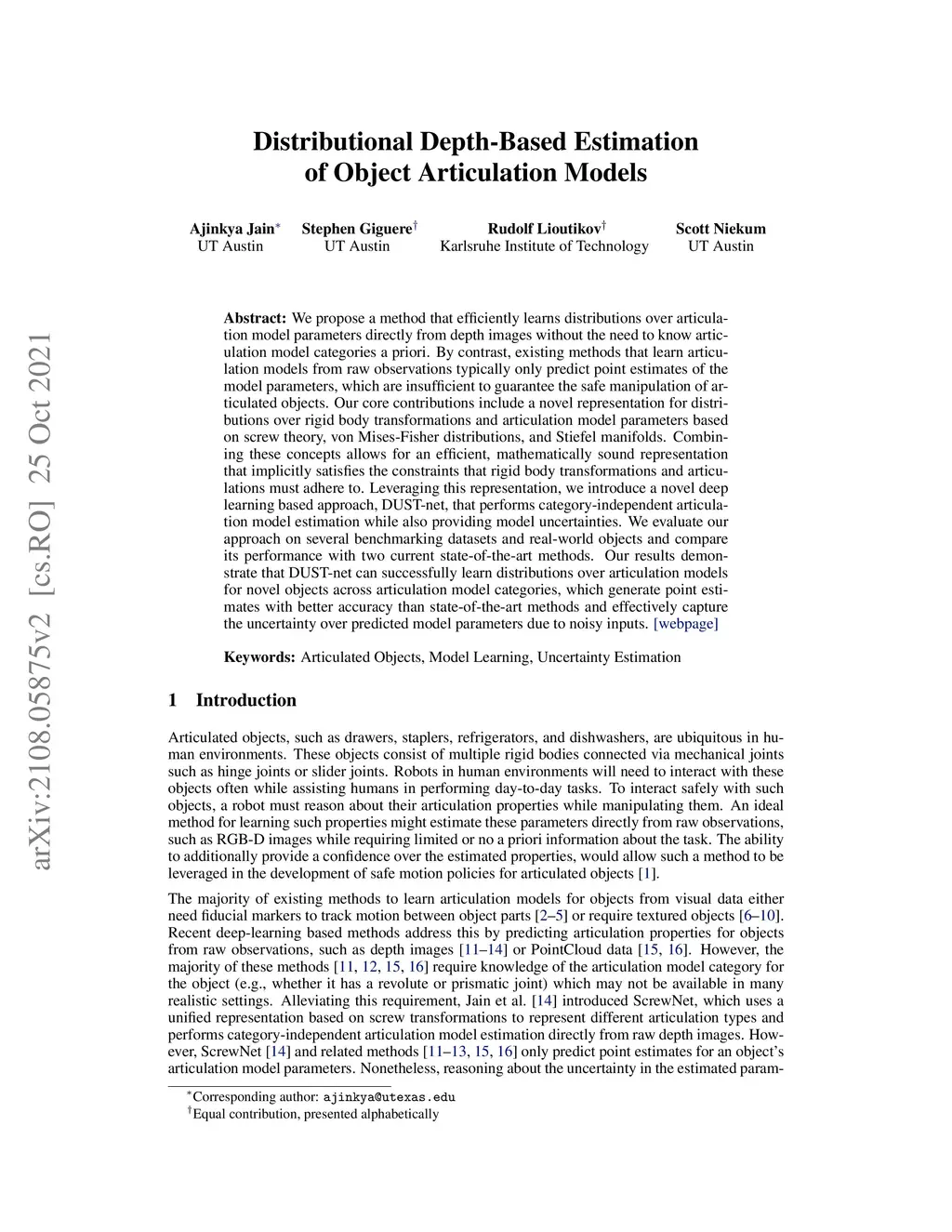 We propose a method that efficiently learns distributions over articulation model parameters directly from depth images without the need to know articulation model categories a priori. By contrast, existing methods that learn articulation models from raw observations typically only predict point estimates of the model parameters, which are insufficient to guarantee the safe manipulation of articulated objects. Our core contributions include a novel representation for distributions over rigid body transformations and articulation model parameters based on screw theory, von Mises-Fisher distributions, and Stiefel manifolds. Combining these concepts allows for an efficient, mathematically sound representation that implicitly satisfies the constraints that rigid body transformations and articulations must adhere to. Leveraging this representation, we introduce a novel deep learning based approach, DUST-net, that performs category-independent articulation model estimation while also providing model uncertainties. We evaluate our approach on several benchmarking datasets and real-world objects and compare its performance with two current state-of-the-art methods. Our results demonstrate that DUST-net can successfully learn distributions over articulation models for novel objects across articulation model categories, which generate point estimates with better accuracy than state-of-the-art methods and effectively capture the uncertainty over predicted model parameters due to noisy inputs. Project webpage: https://pearl-utexas.github.io/DUST-net/